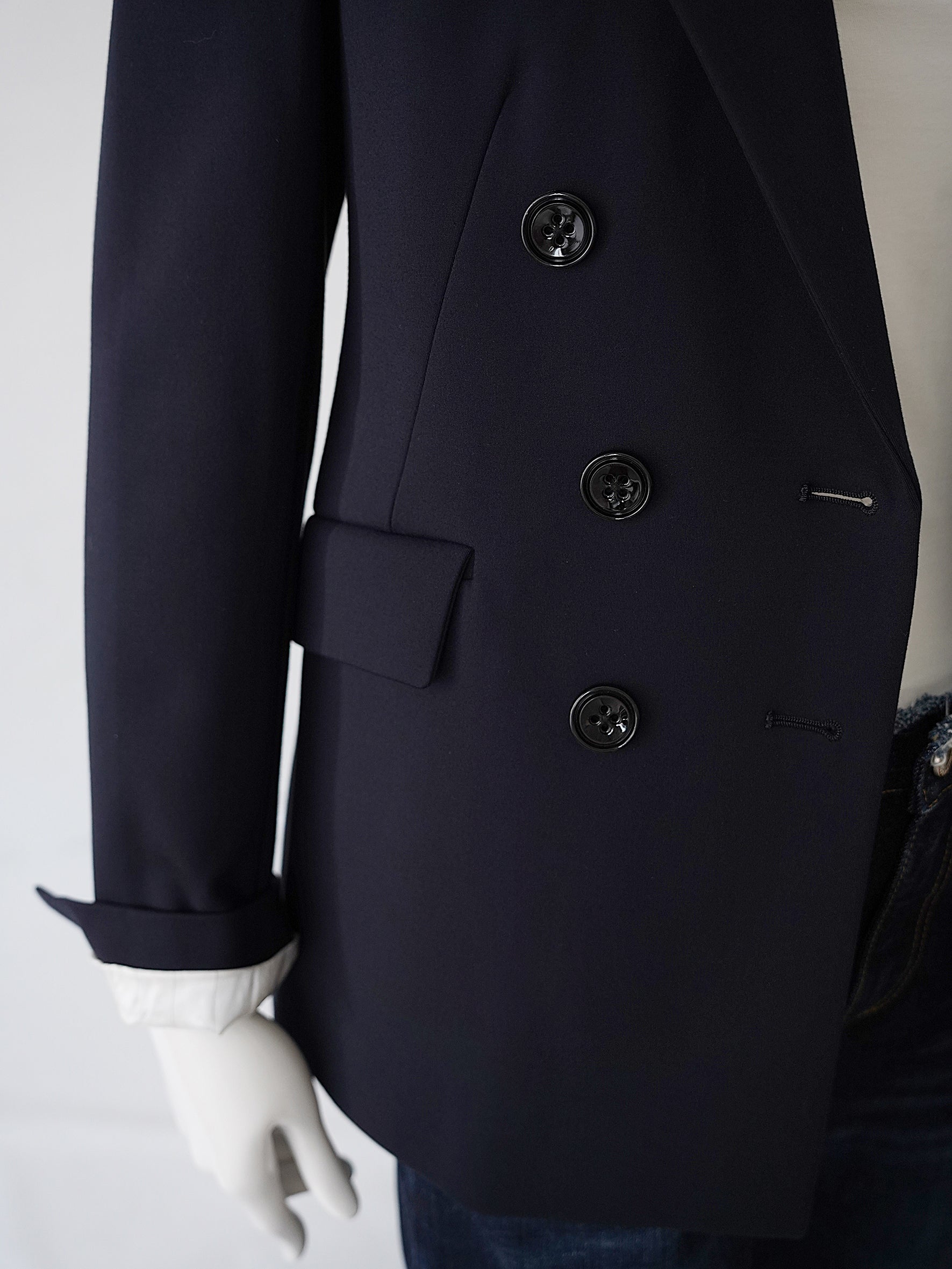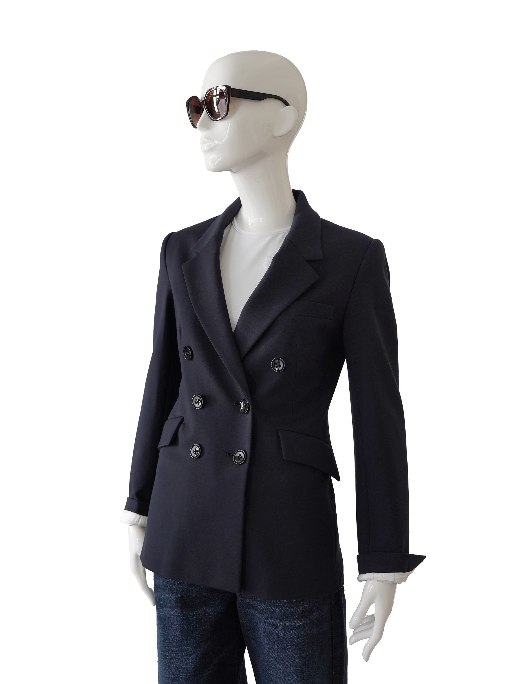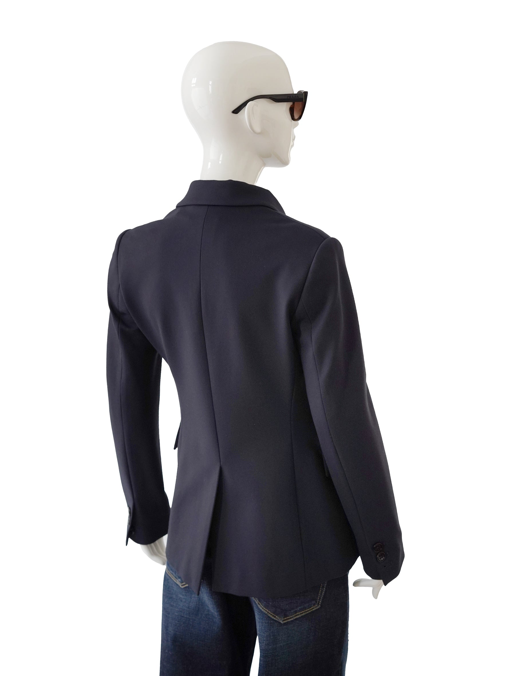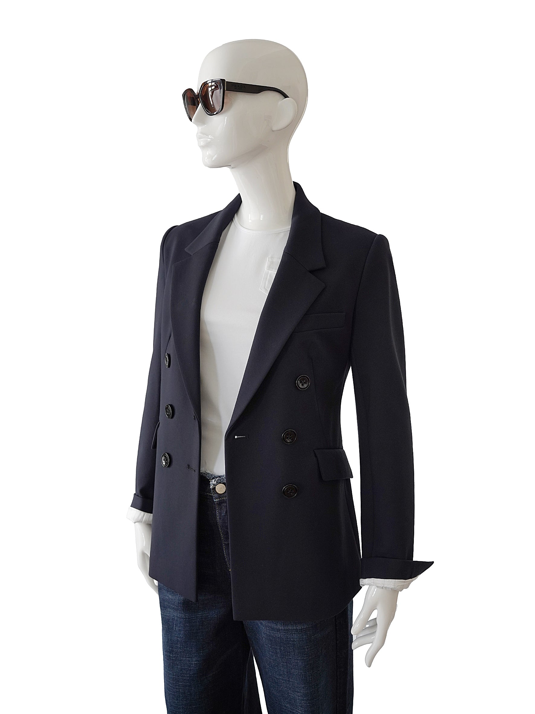The blazer's deep dark blue hue exudes both versatility and sophistication. The double-breasted button placket adds a formal touch and ensures a structured, figure-flattering fit. This design element enhances the classic cut and makes the blazer a true eye-catcher.
