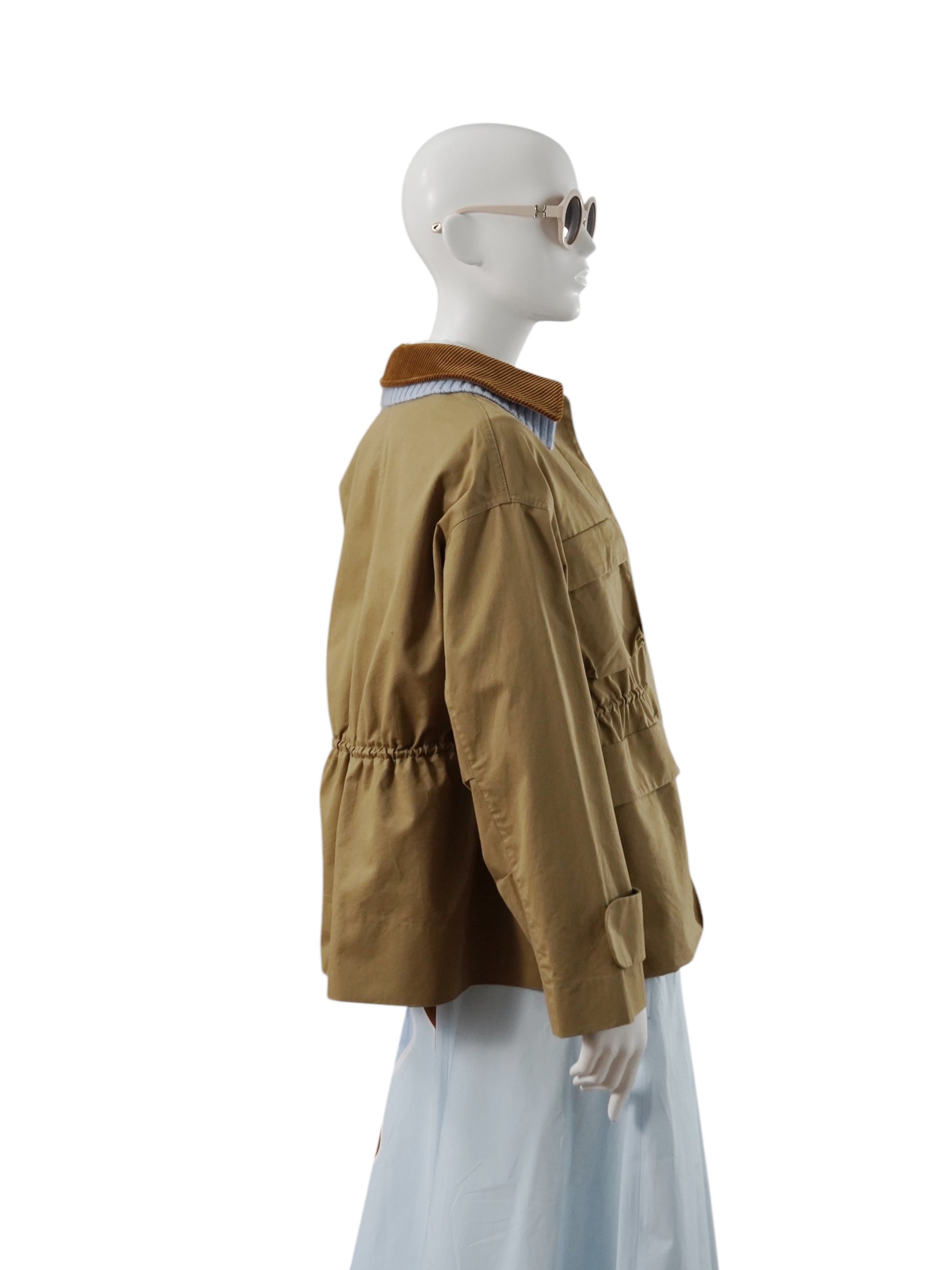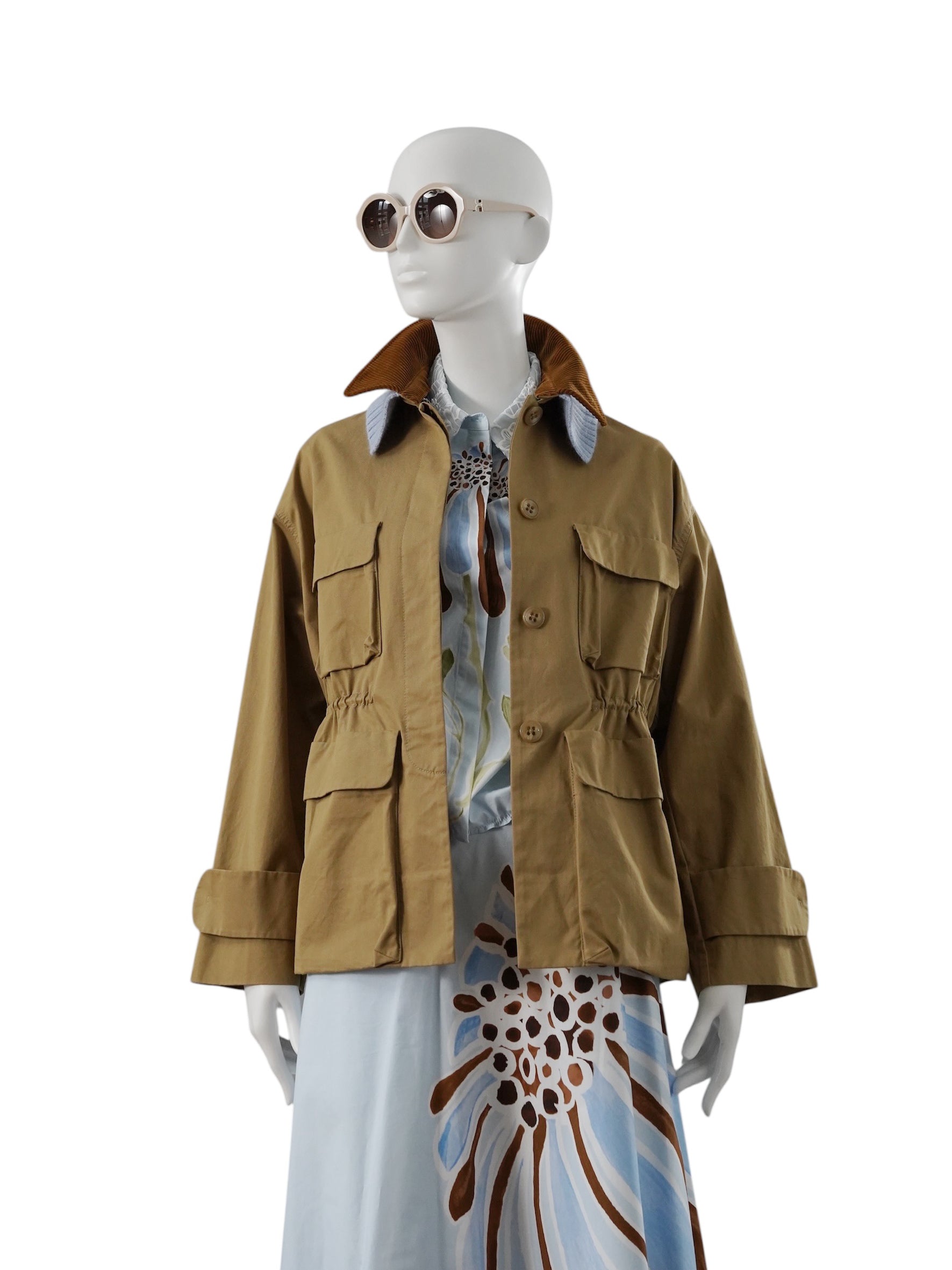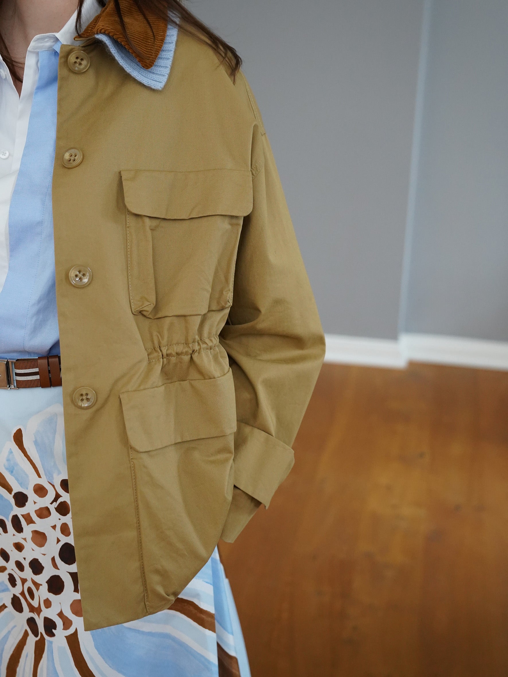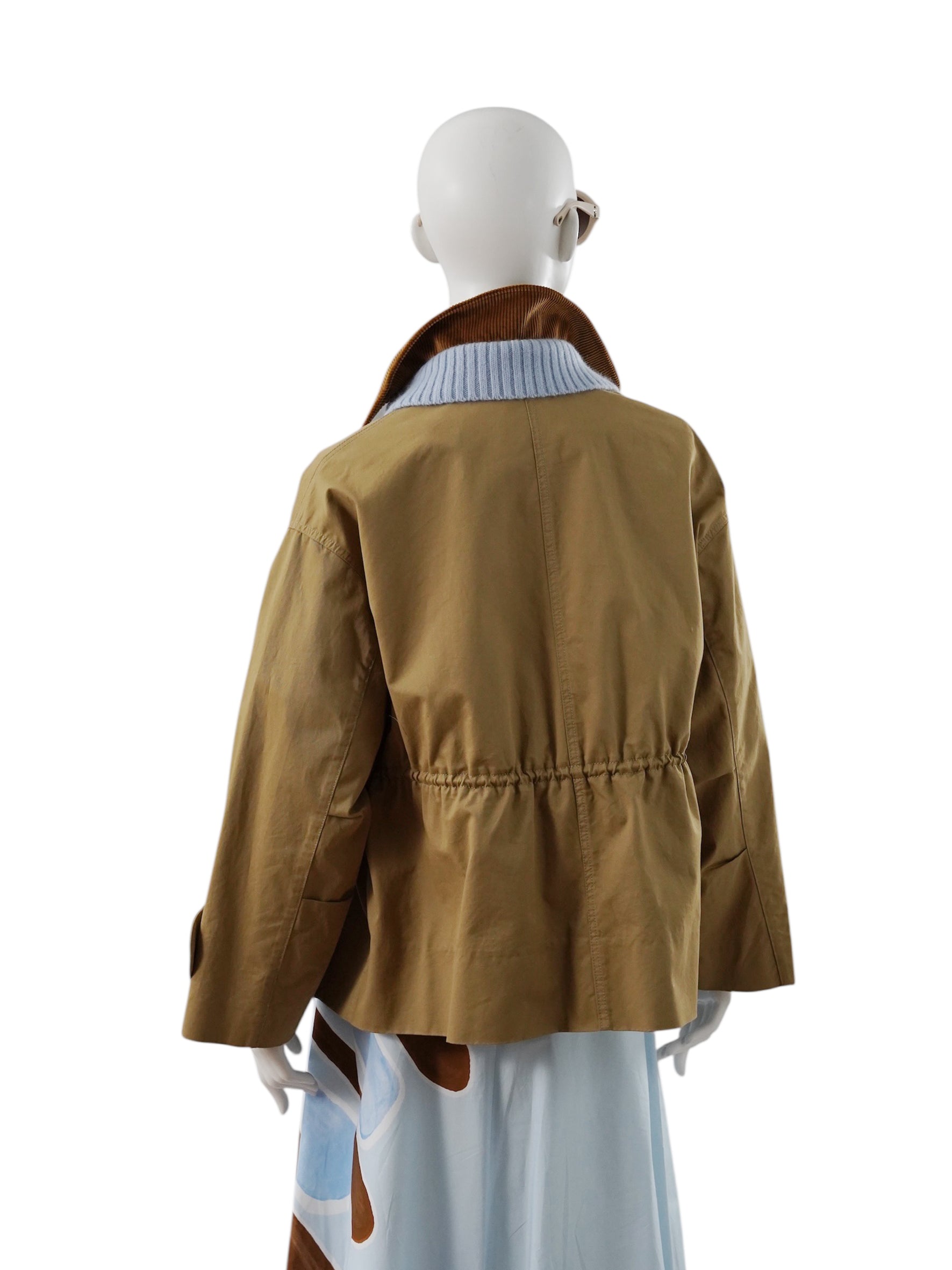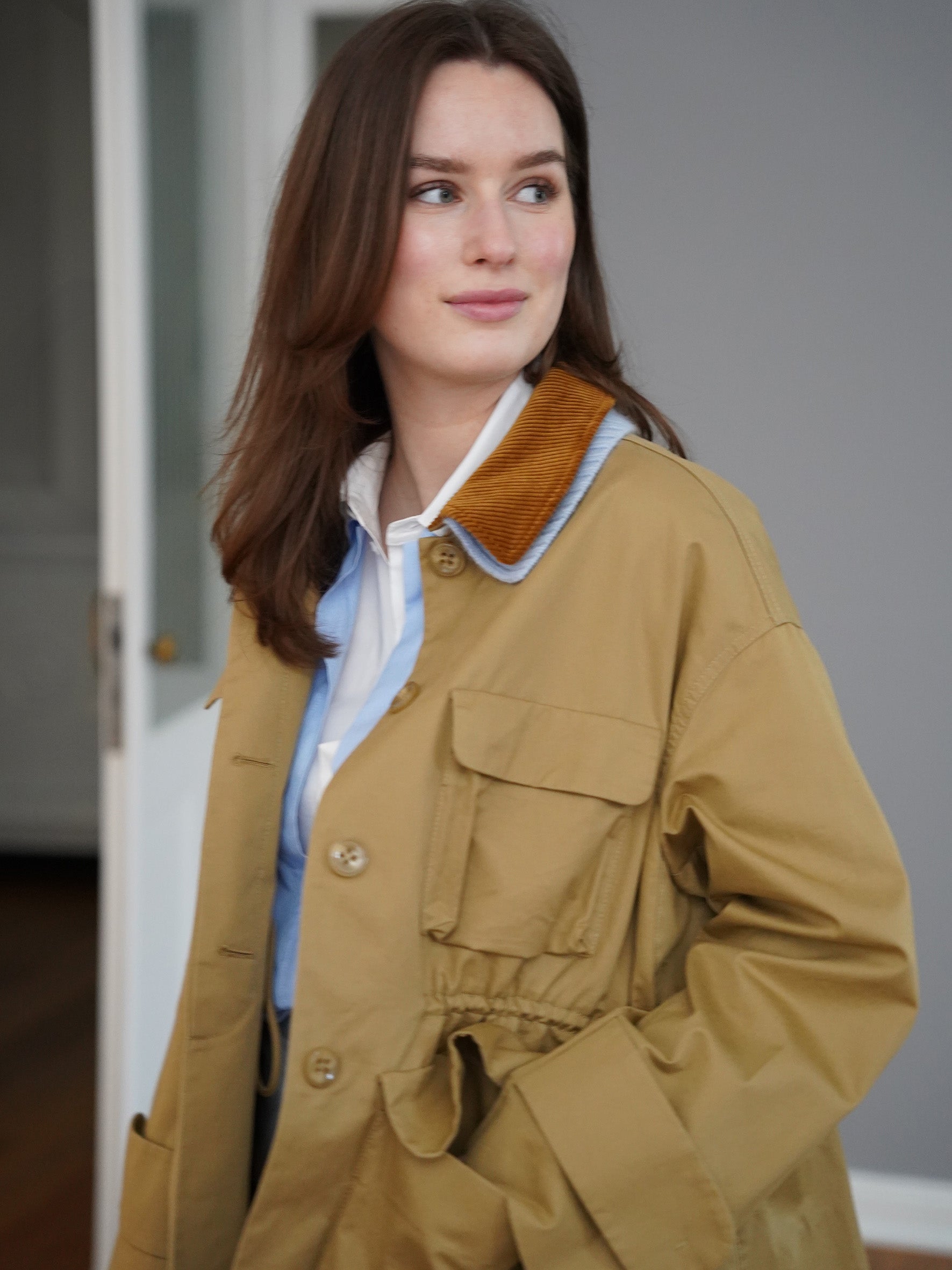 Camelfarbene Jacke mit blau/braunen Kragen-Details