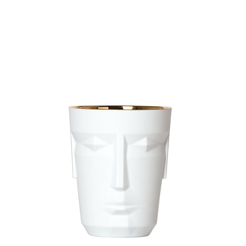 PROMETHEUS – a heroic figure from Greek mythology, lends his name to the ice bucket and cups. This porcelain object is suitable for chilling wine or champagne. With a matte satin finish on the outside, Prometheus's facial features are particularly striking and underline the object's noble aura. Prometheus, as a cooler or cup, is entirely handcrafted to the highest quality and is available in matte white/glossy white, matte white/gold, or matte black/gold combinations.