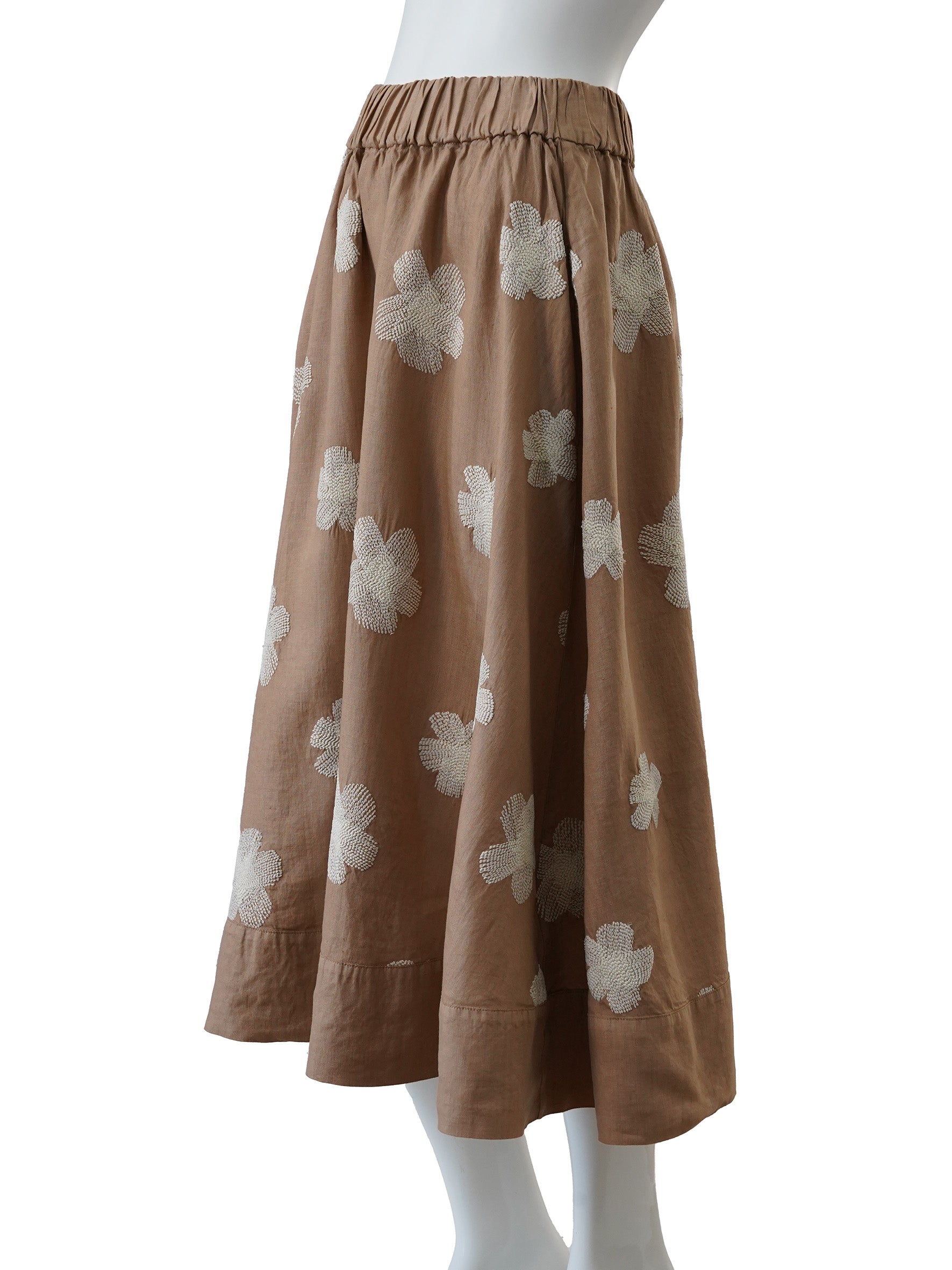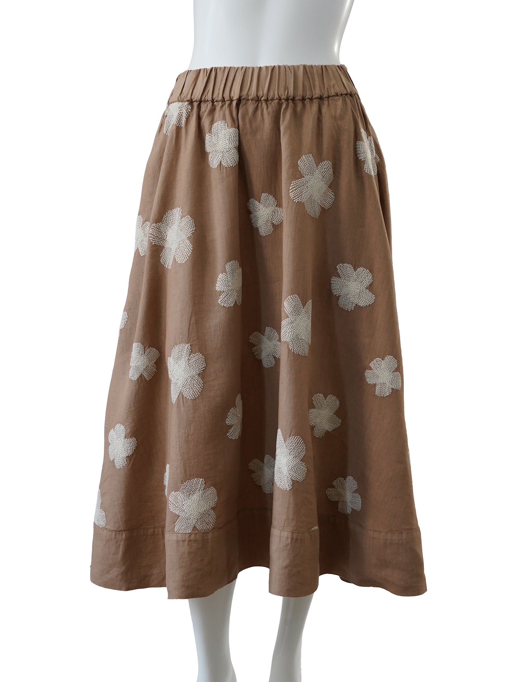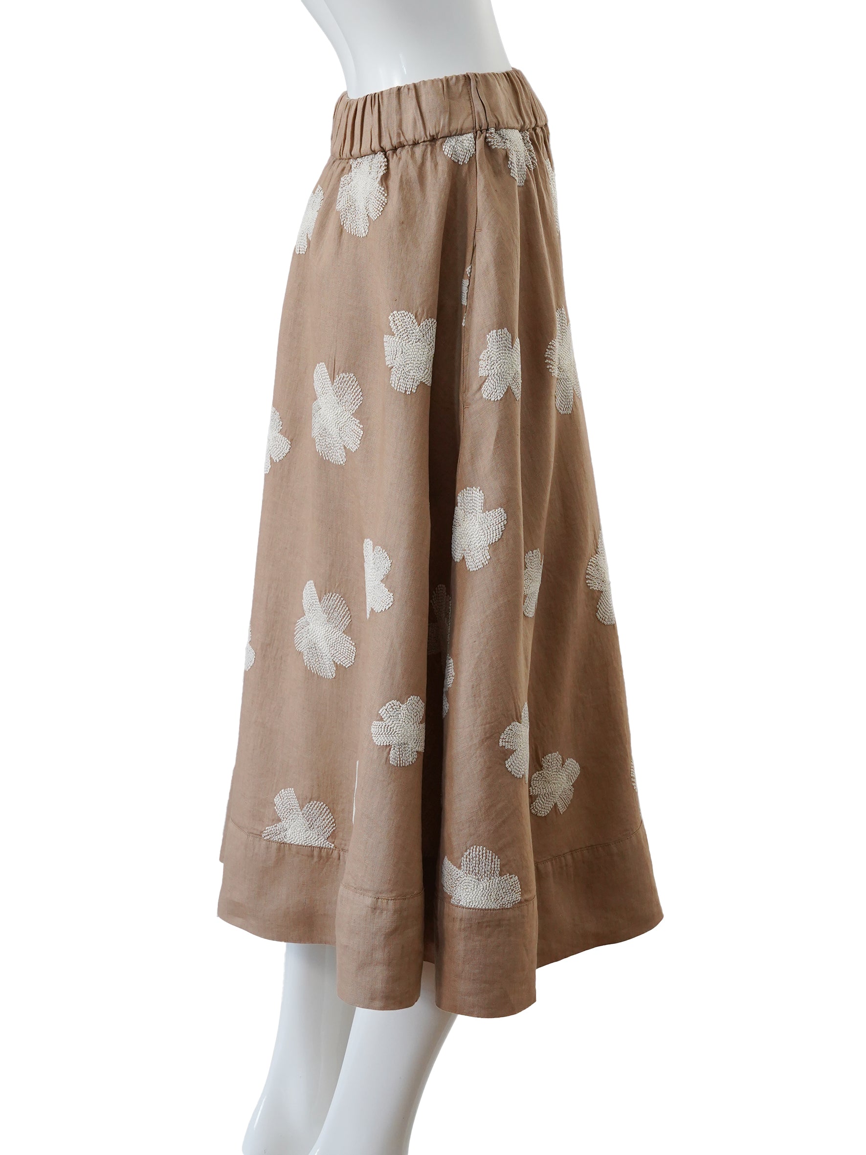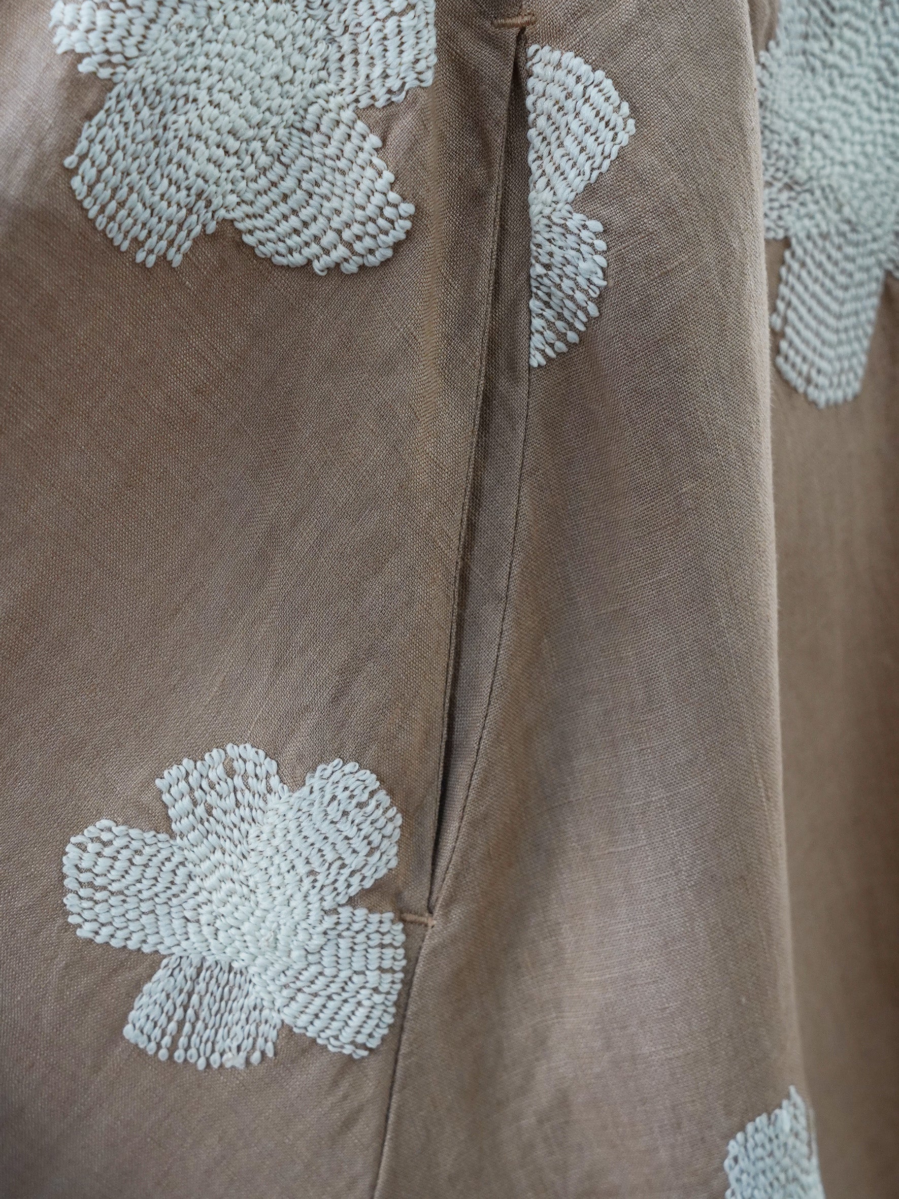 Camelfarbener Leinen-Rock mit cremefarbenen Büten