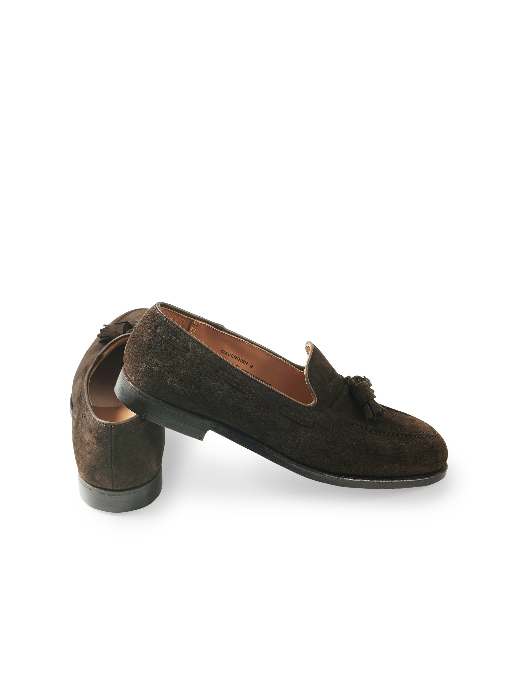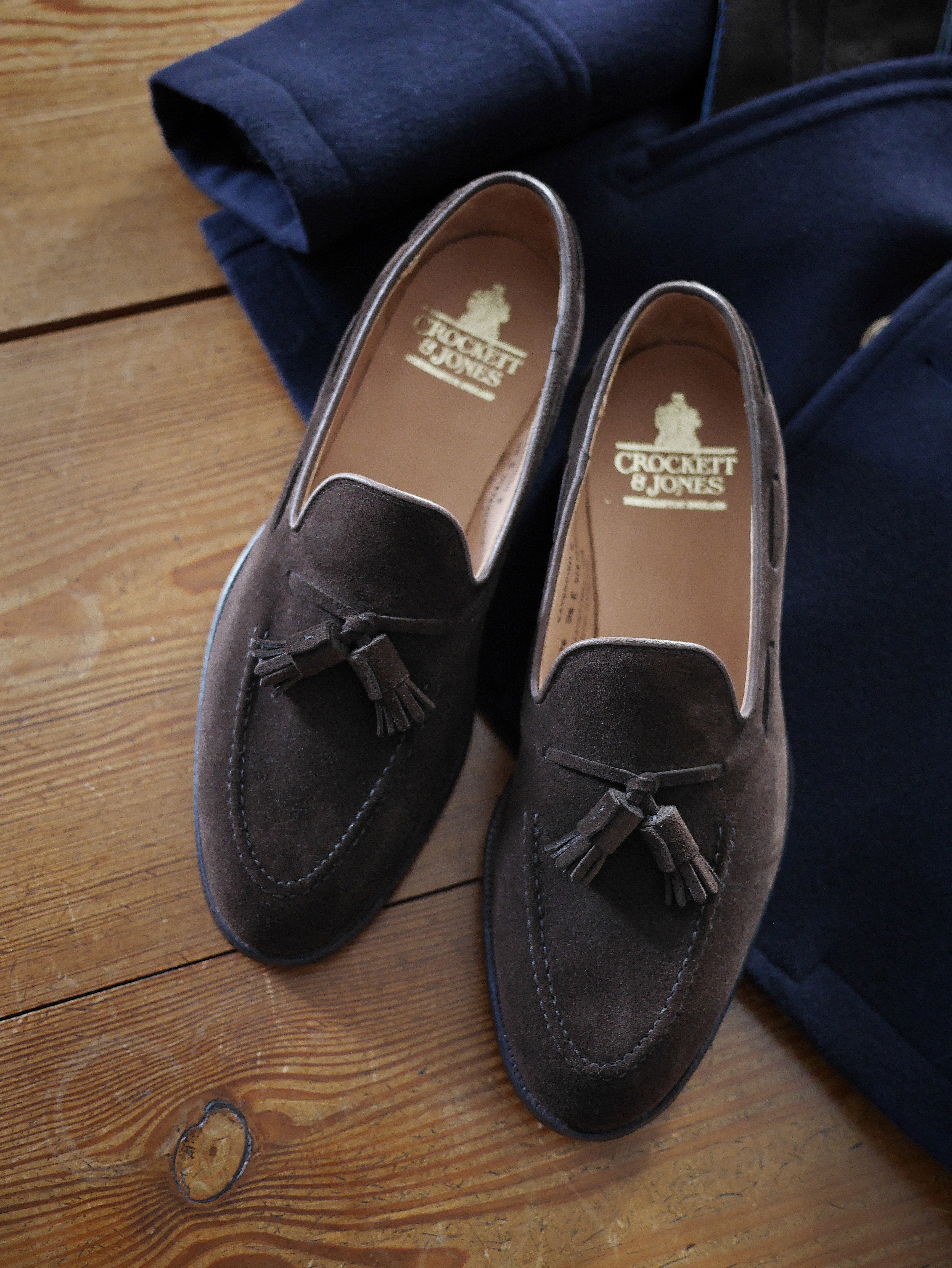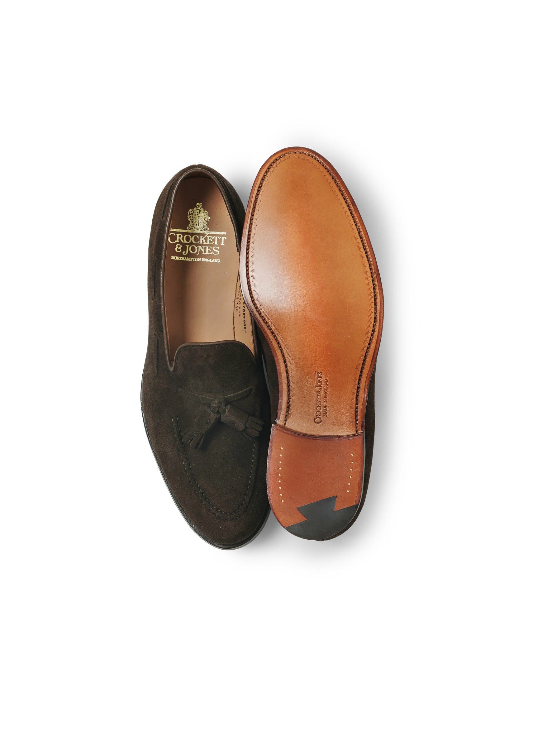 The signature loafer from Crockett & Jones, our tassel loafer made of sturdy dark brown suede. A perfect companion for a sporty preppy look, paired with chinos, corduroy, and denim. The loafer is Goodyear-welted yet still offers Crockett & Jones's signature comfort.