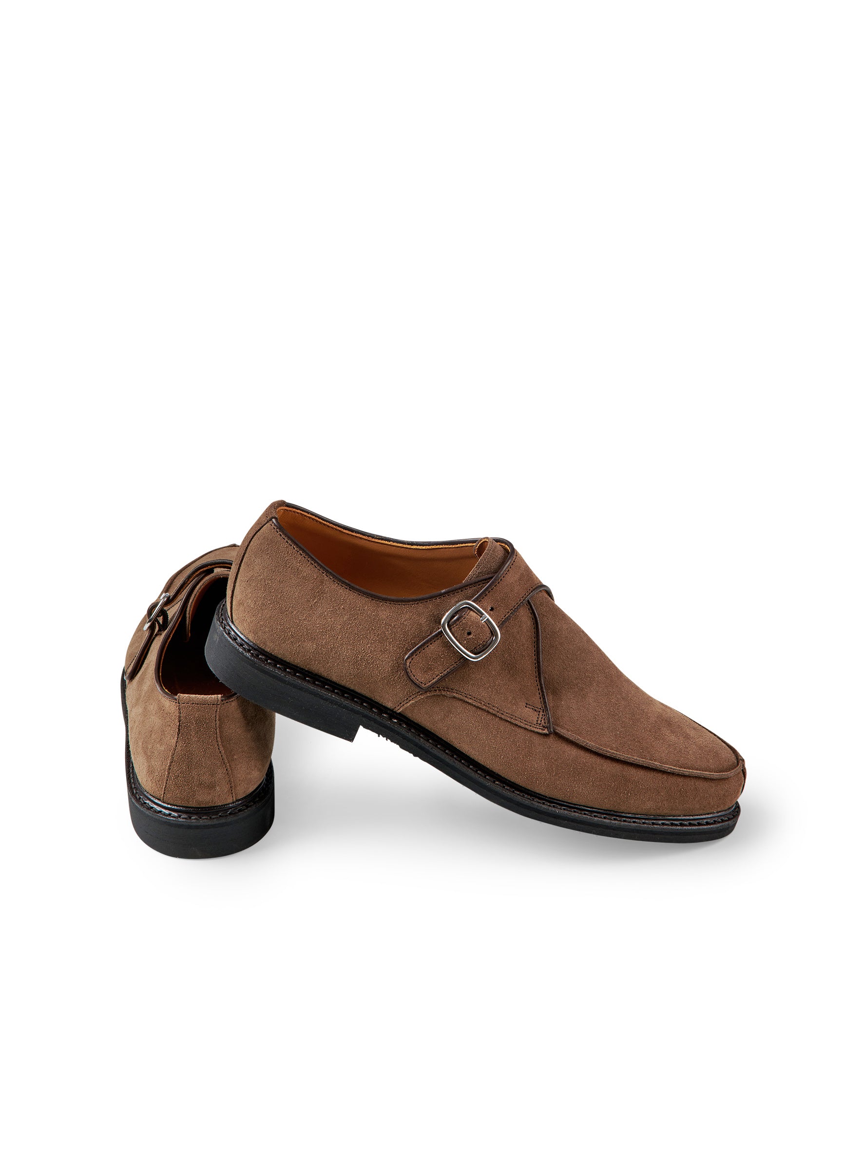 Taupe-colored suede monk with Norwegian seam and all-weather sole