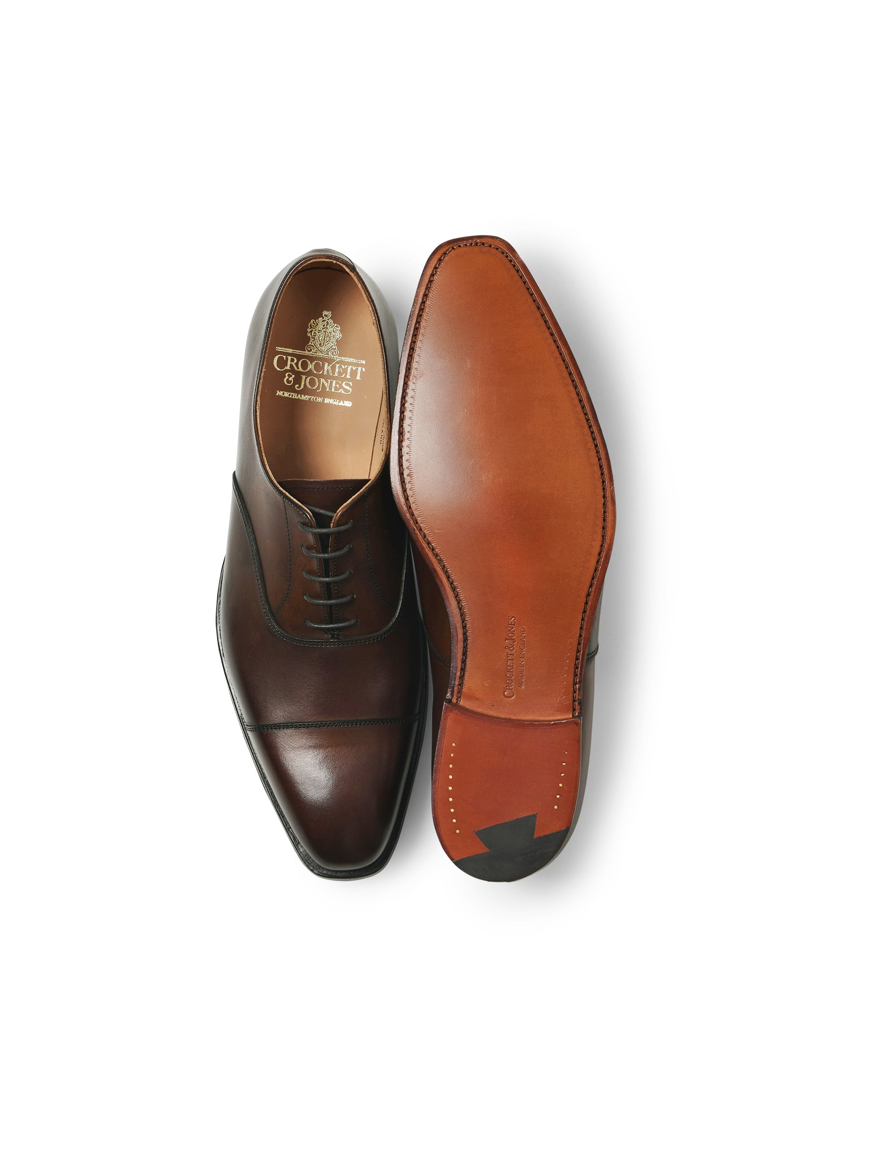 Klassischer Cap-Toe Oxford aus kastanienbraunem, handgefärbtem Leder. Ein perfekter Begleiter für den kultivierten Business-Look. Der Oxford ist rahmengenäht und verfügt trotzdem über die Crockett & Jones typische Bequemlichkeit.