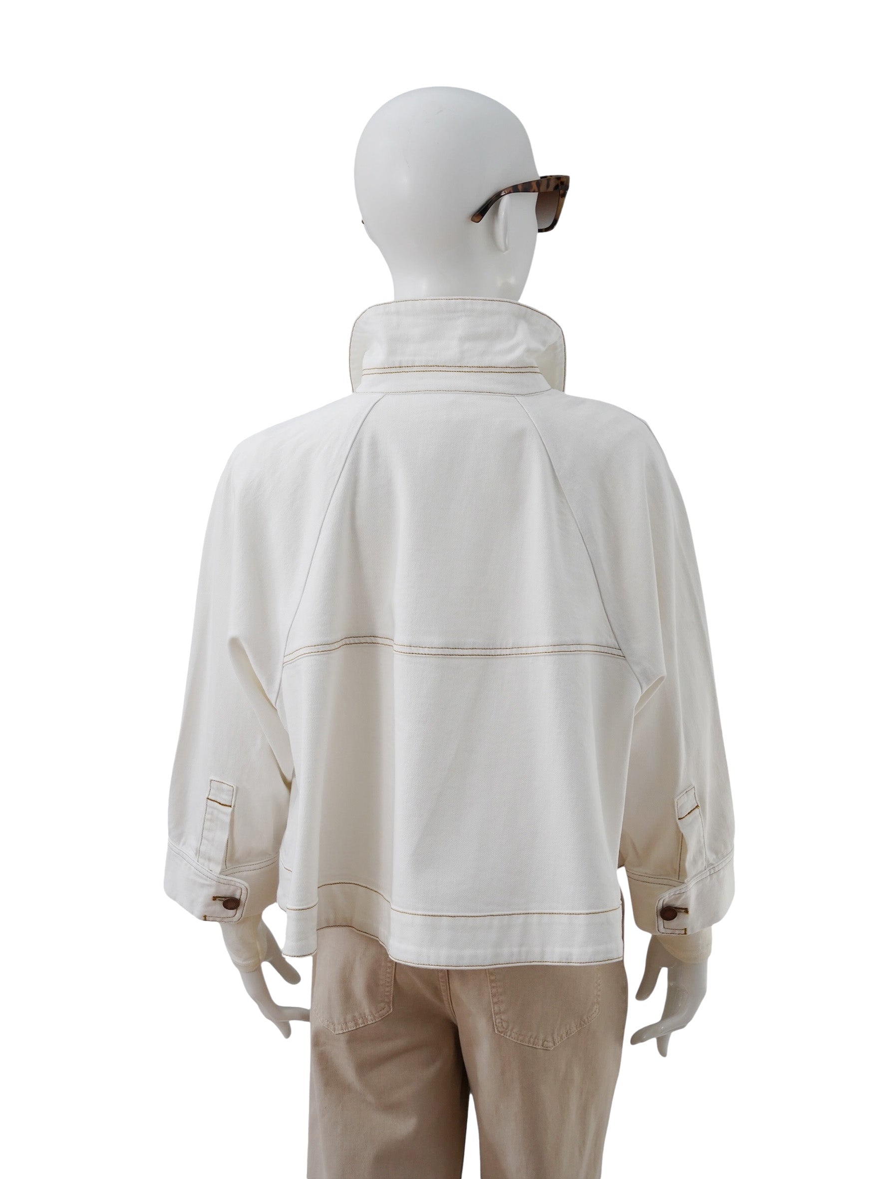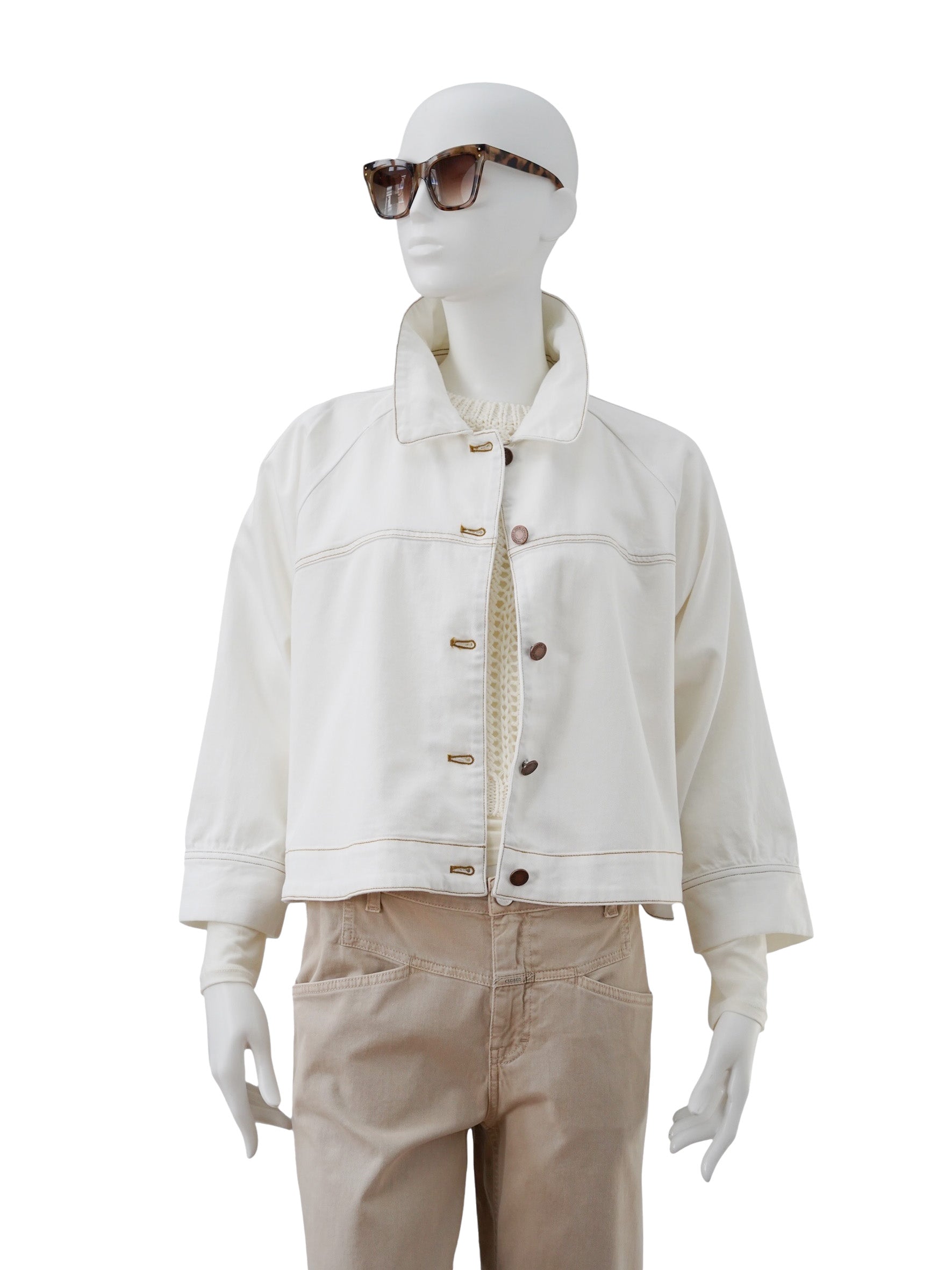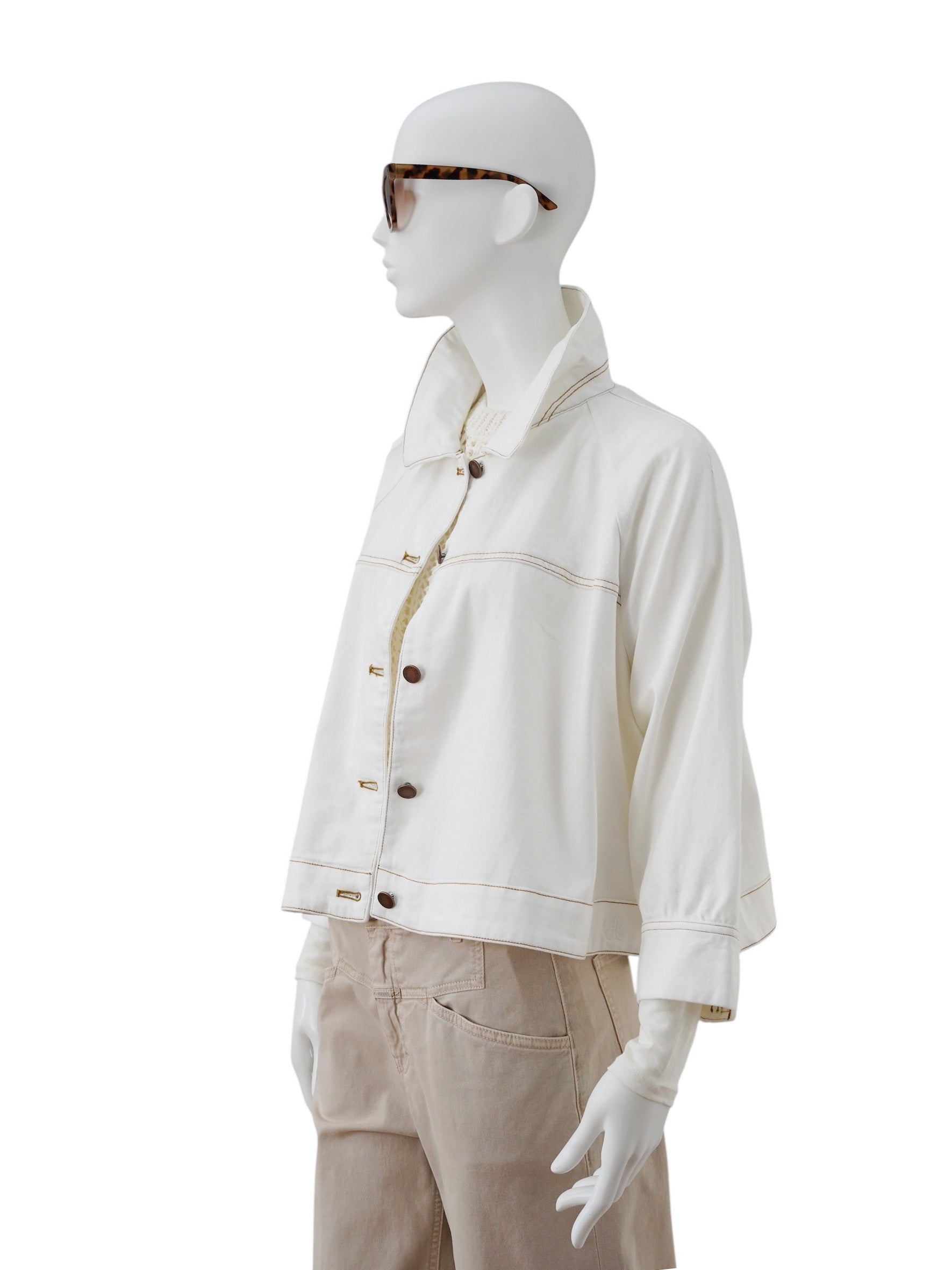 Die camelfarbenen Kontrastnähte setzen ein modernes Statement und heben diese Jacke aus der Masse heraus. Sie verleihen dem klassischen Weiß eine raffinierte Note, die deinen Look sofort aufwertet.