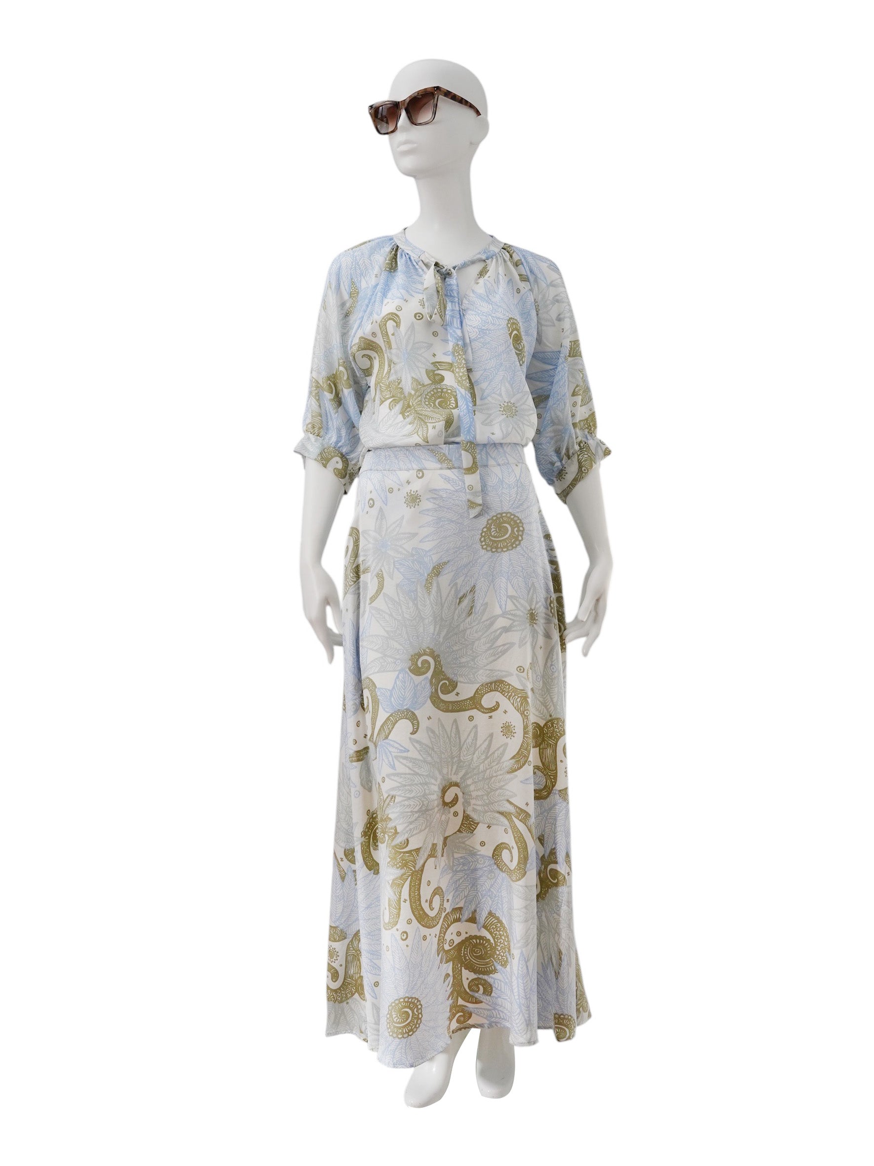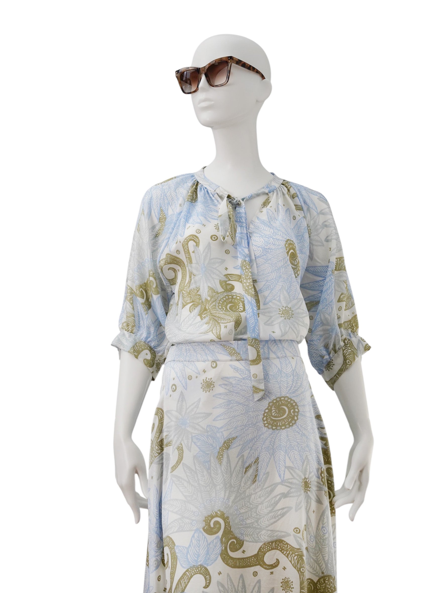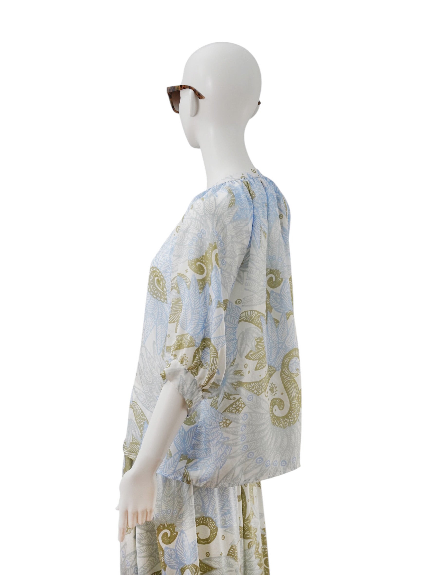 Entdecke die Eleganz dieser gemusterten Halbarm-Seidenbluse von Hemisphere – ein zeitloses Stück für deinen Kleiderschrank. Das wunderschöne florales Paisleymuster in zartem Hellblau und beruhigendem Salbeigrün verleiht dir einen raffinierten Look, der mühelos zwischen verschiedenen Stilen wechselt.