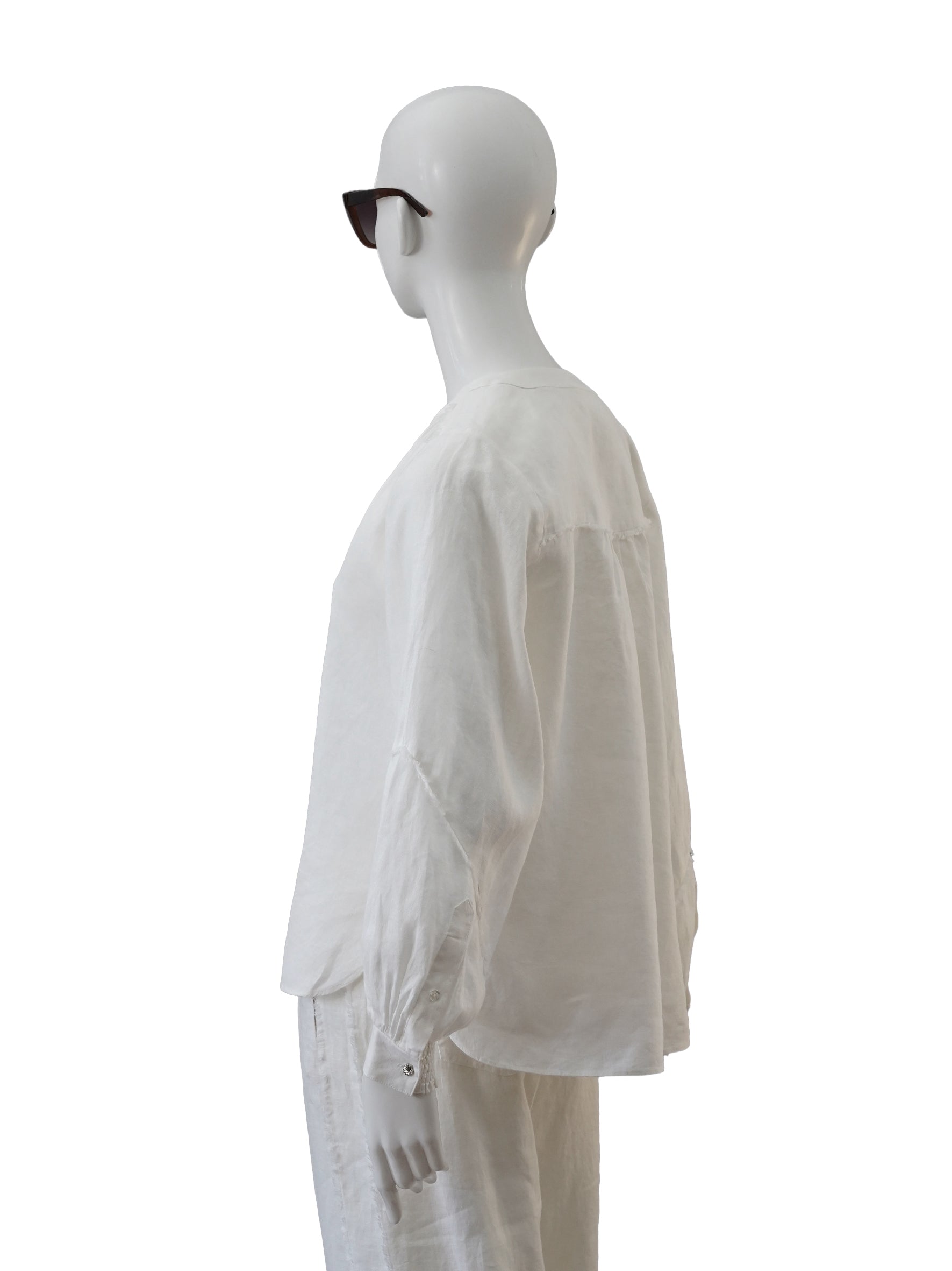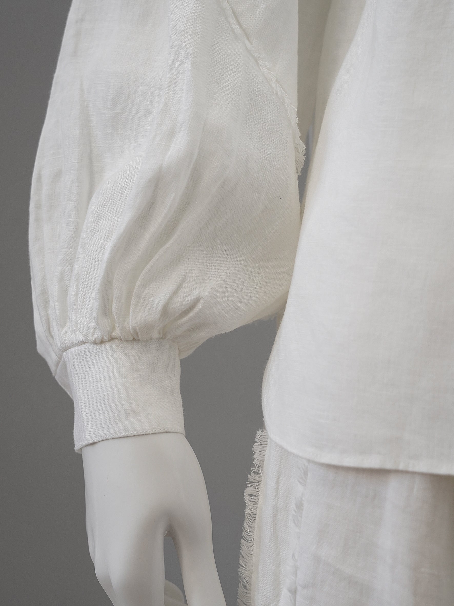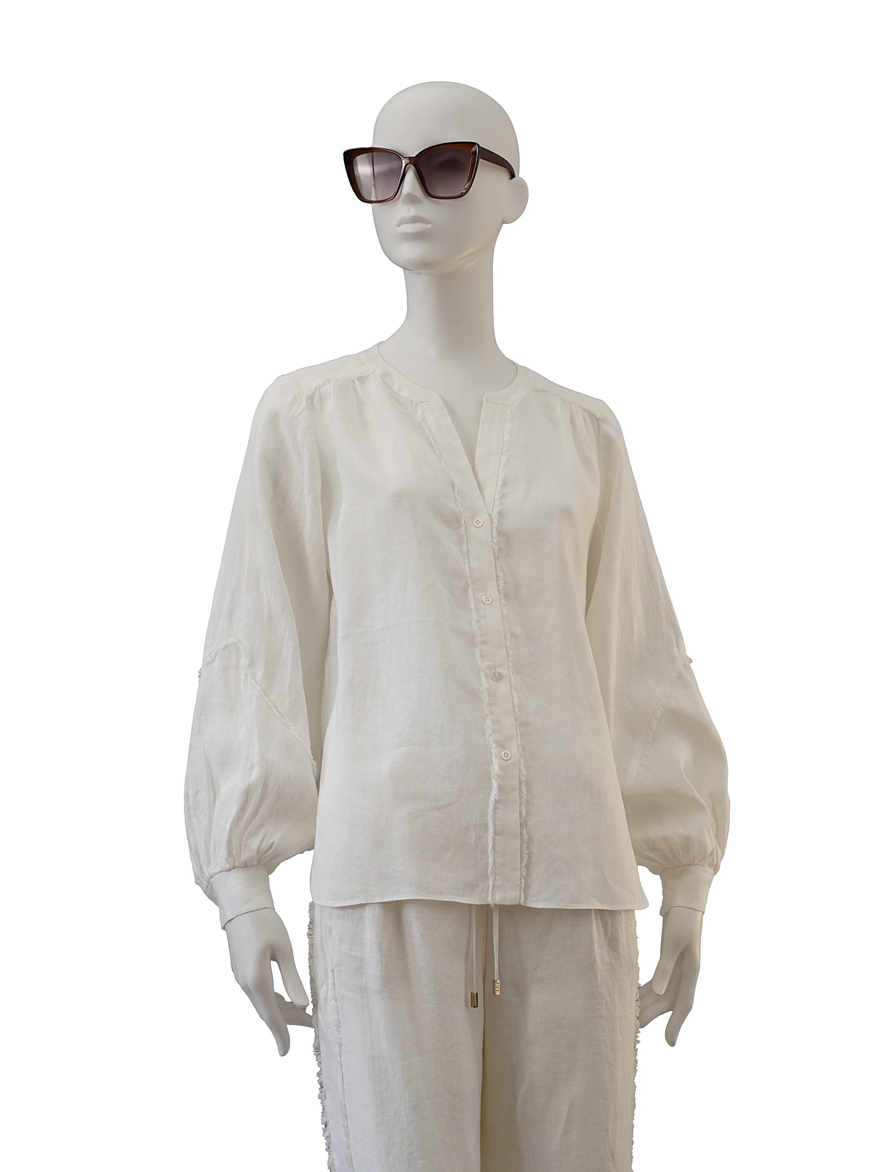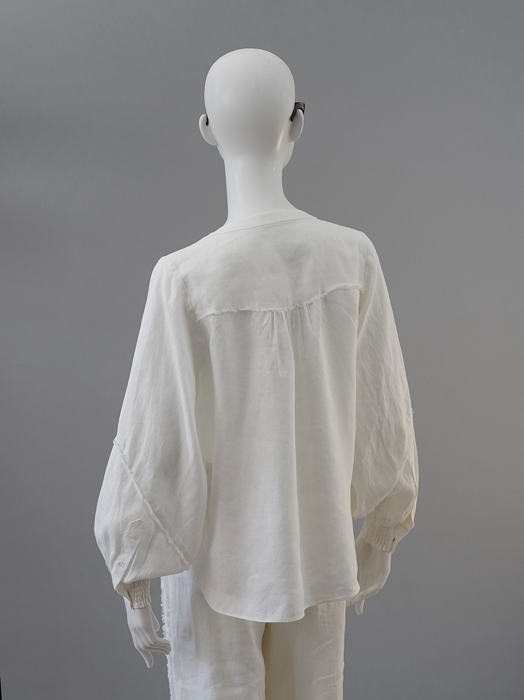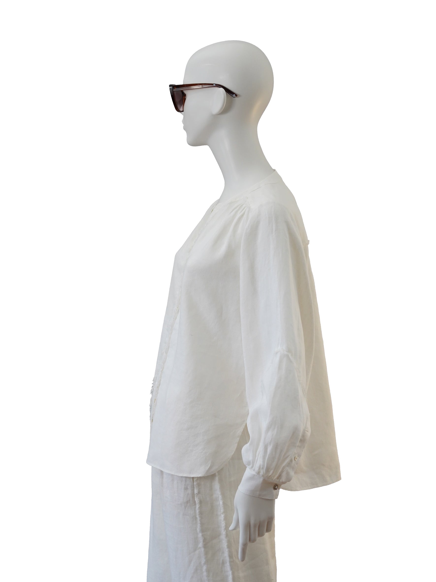 Cremefarbene Leinen-Bluse von IVI mit charaktervollem Stehkragen und ausgefransten Biesen an der Knopfleiste. Das natürliche Material sorgt für angenehme Atmungsaktivität und sommerliche Leichtigkeit. Ein Statement-Piece mit verspieltem Detailreichtum, das locker über der Jeans genauso gut aussieht wie zur passenden Leinenhose. Perfekt für alle, die es lieber etwas lässiger und weniger konventionell mögen.
