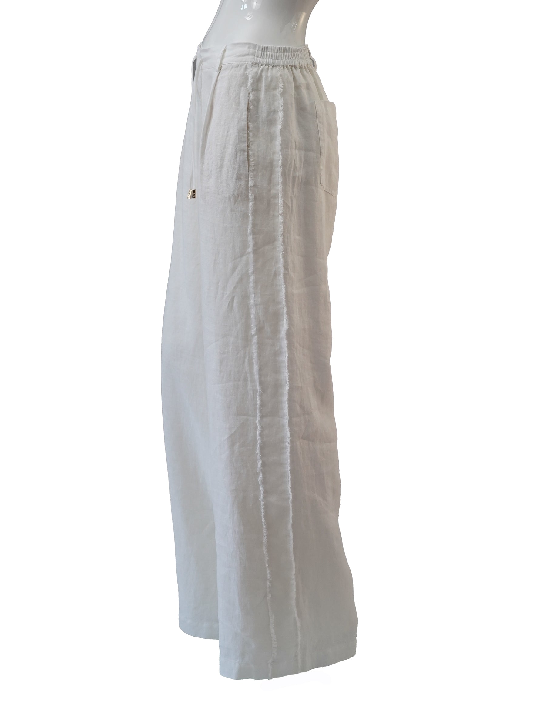 Cremefarbene Leinen-Hose in klassischer Marlene-Form – zeitlos elegant und herrlich luftig. Das Besondere: der leicht ausgefranste Gallon an der Seite verleiht dieser IVI-Kreation einen lässig-modernen Touch. Perfekt für warme Tage, wenn du Komfort und Style in einem möchtest. Ein Basics-Piece, das einfach immer passt.