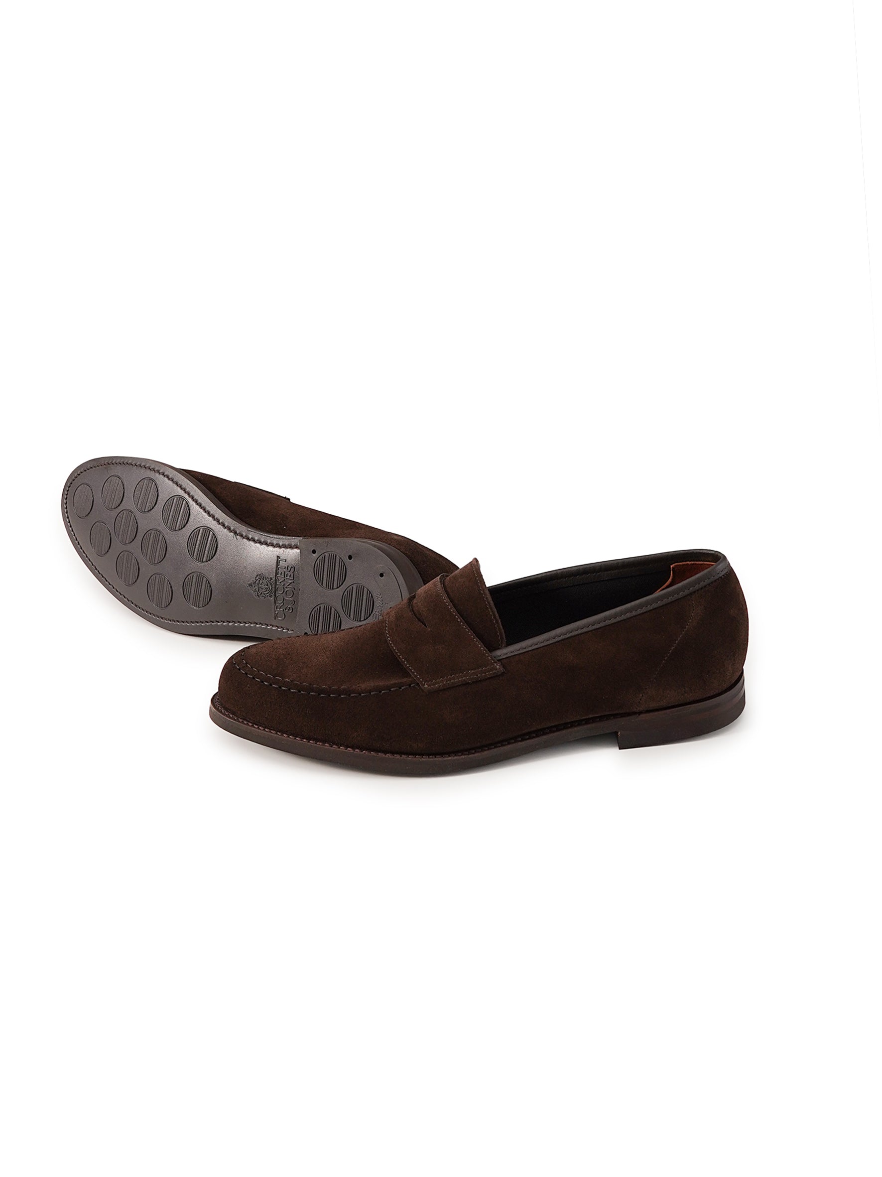 Klassischer, ungefütterter Penny-Loafer aus robustem dunkelbraunen Velours. Ein perfekter Begleiter für den sportiven Preppy-Look, zu Chinos, Cord, und Denim. Der Loafer ist rahmengenäht und verfügt trotzdem über die Crockett & Jones typische Bequemlichkeit.