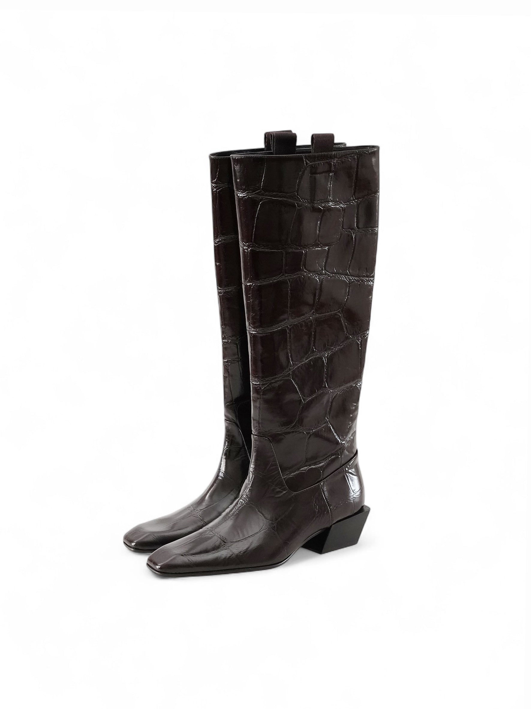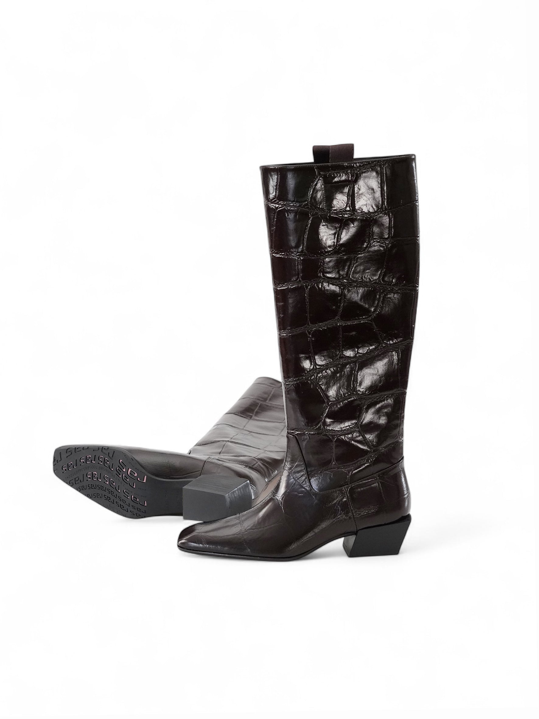 Dunkelbrauner Stiefel mit Kroko-Print