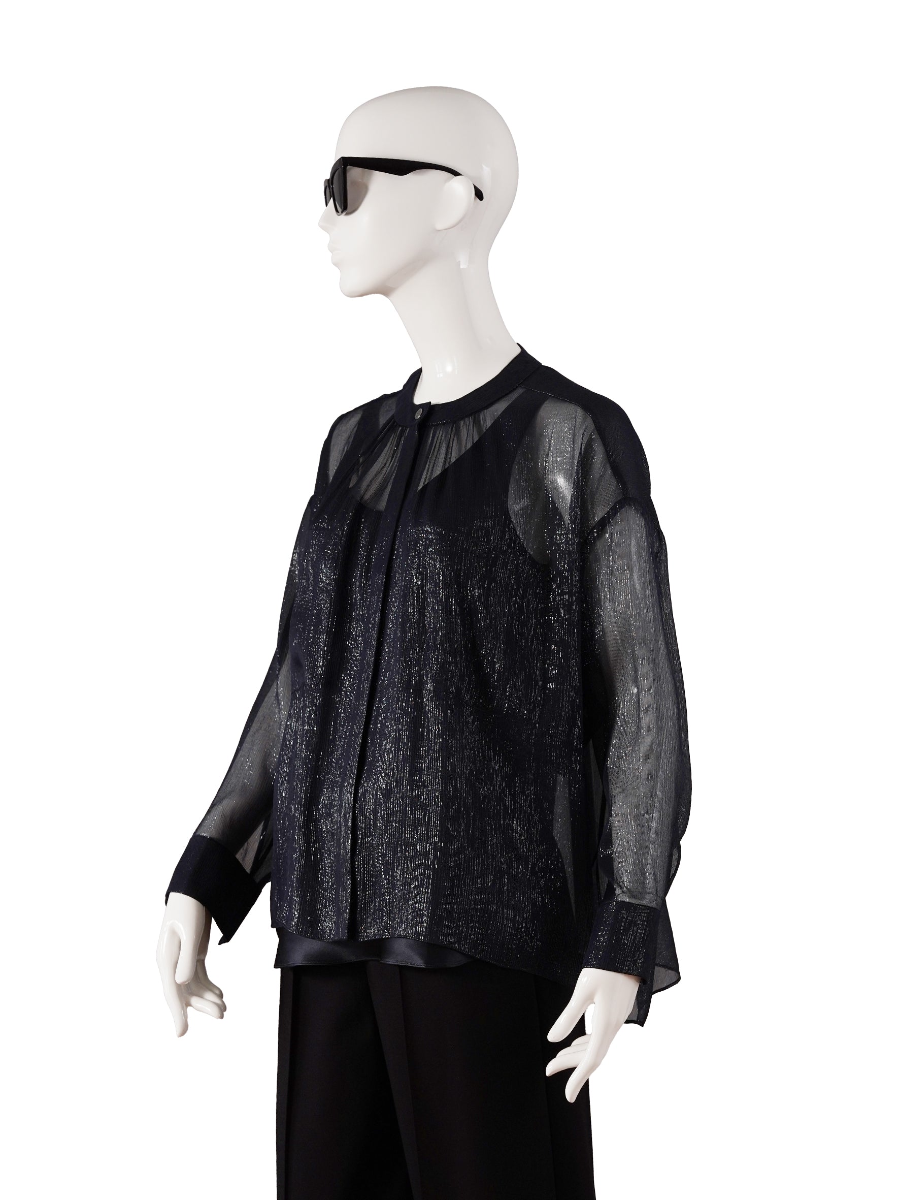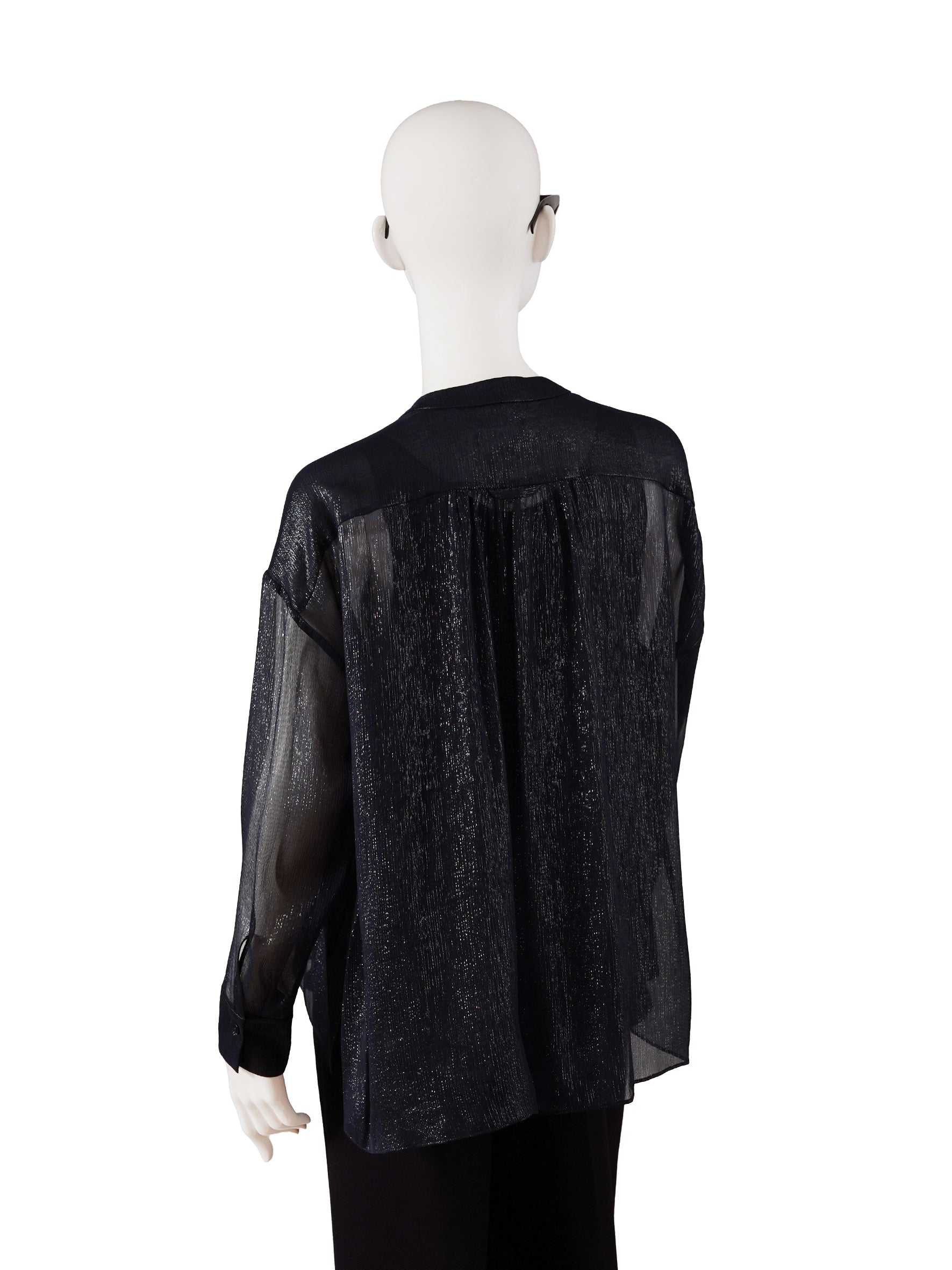 Dunkelblaue Seidenbluse mit Lurexfäden und aufgesetzten Taschen