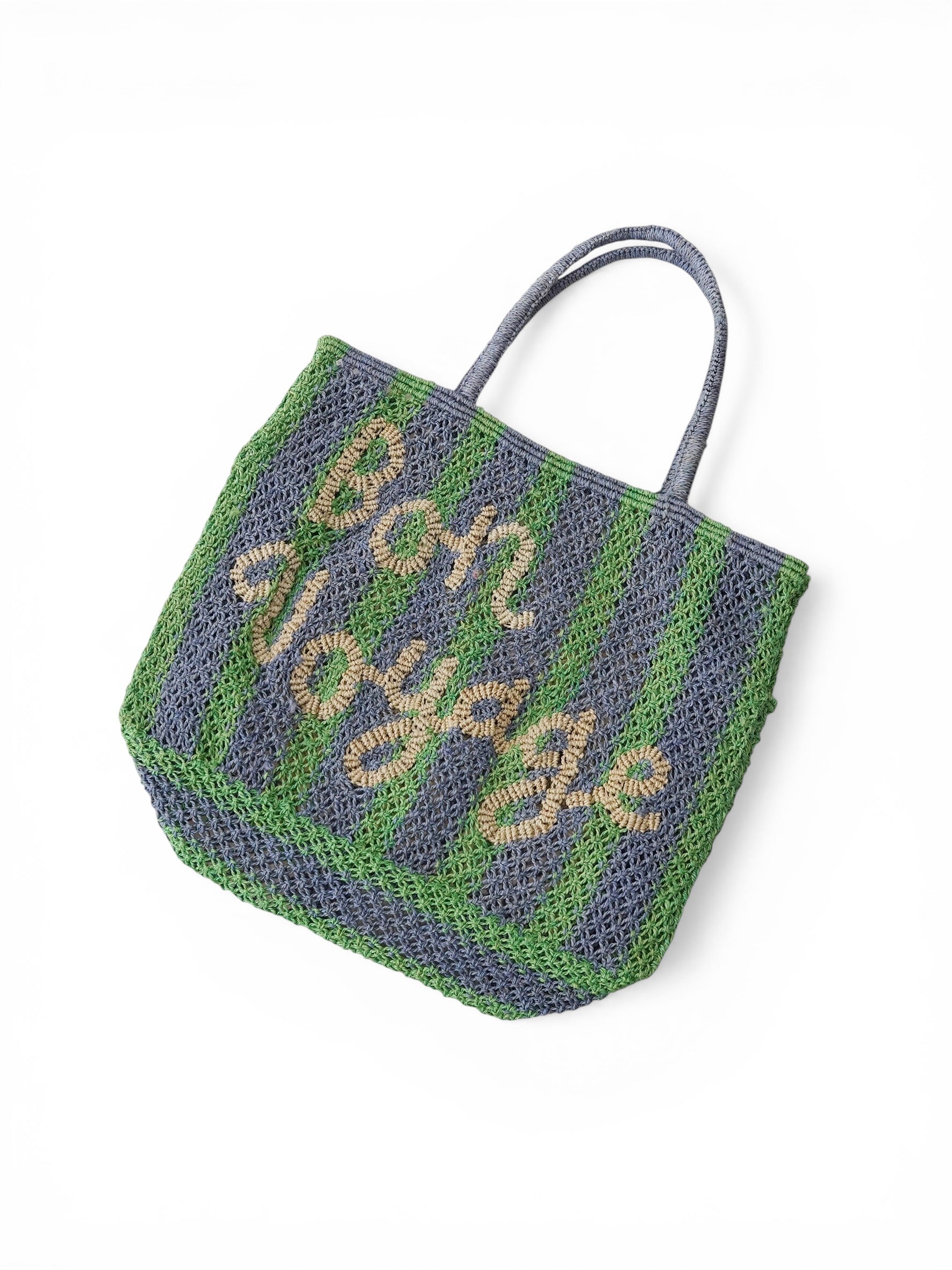 Blau/Grün gestreifte Bast-Tasche mit Schriftzug "Bon Voyage"