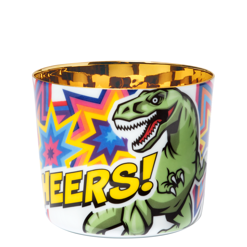 Champagnerbecher Rumble Rex, außen Porzellan, der Becherrand und die Innenseite sind vergoldet. Diese Serie bedient sich auf ironische, phantasievolle Weise verschiedener fiktiver Comic-Helden.