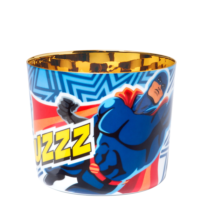 Champagnerbecher Star Man, außen Porzellan, der Becherrand und die Innenseite sind vergoldet. Diese Serie bedient sich auf ironische, phantasievolle Weise verschiedener fiktiver Comic-Helden.
