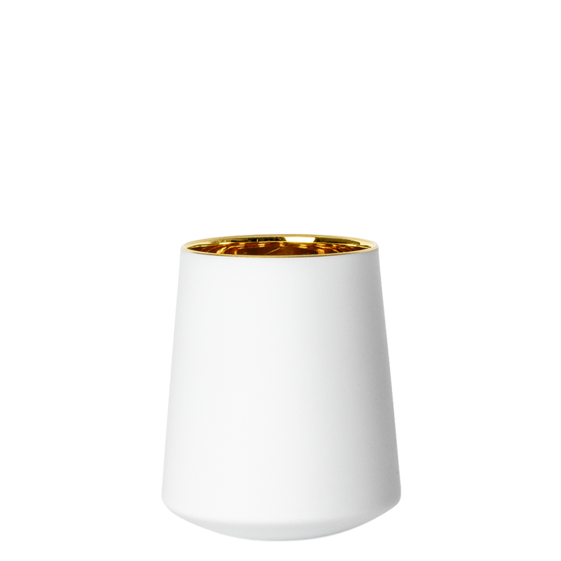 Das puristische Weiß der Wein- und Digestifbecher steht im eleganten Kontrast zu dem opulenten, warm leuchtenden 24-Karat-Gold im Inneren. Es unterstreicht die zarte Wertigkeit des Porzellans und hat einen zusätzlichen Effekt: Weiß- und Roséweine behalten ihre erfrischende Kühle, Rotweine lange ihre vorgegebene Trinktemperatur.
