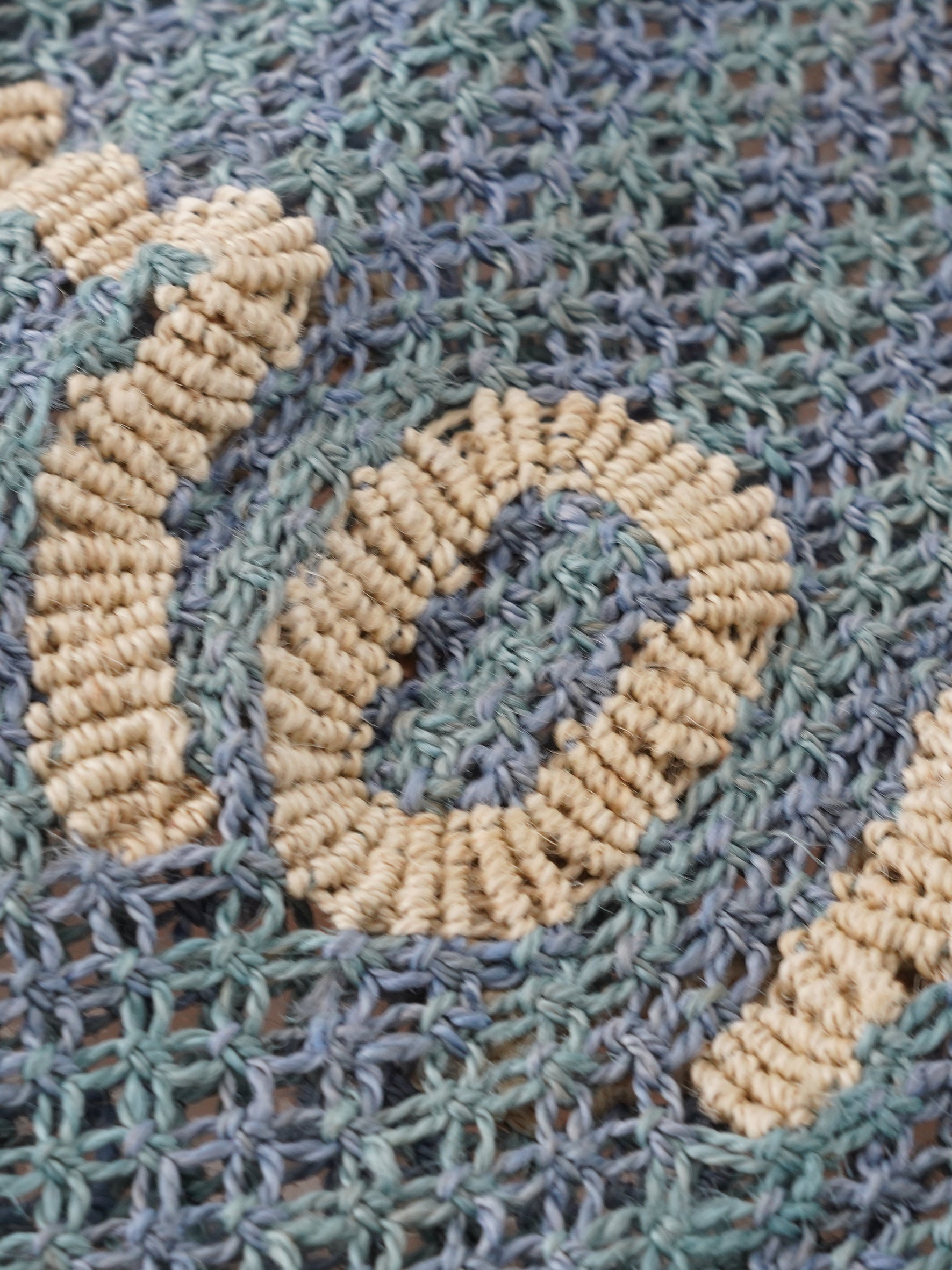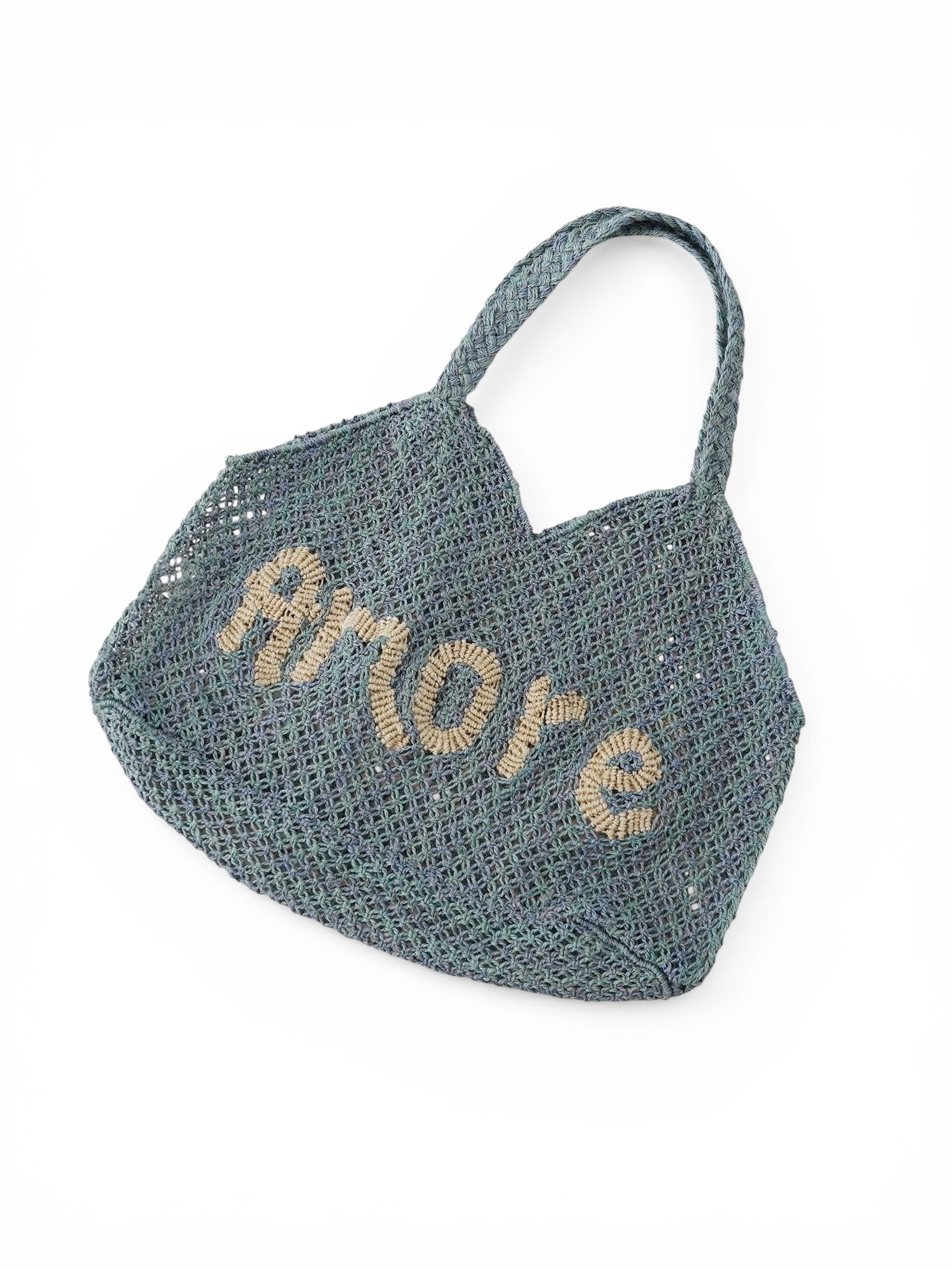 Blaue Bast-Tasche mit sandfarbenem Schriftzug "Amore"