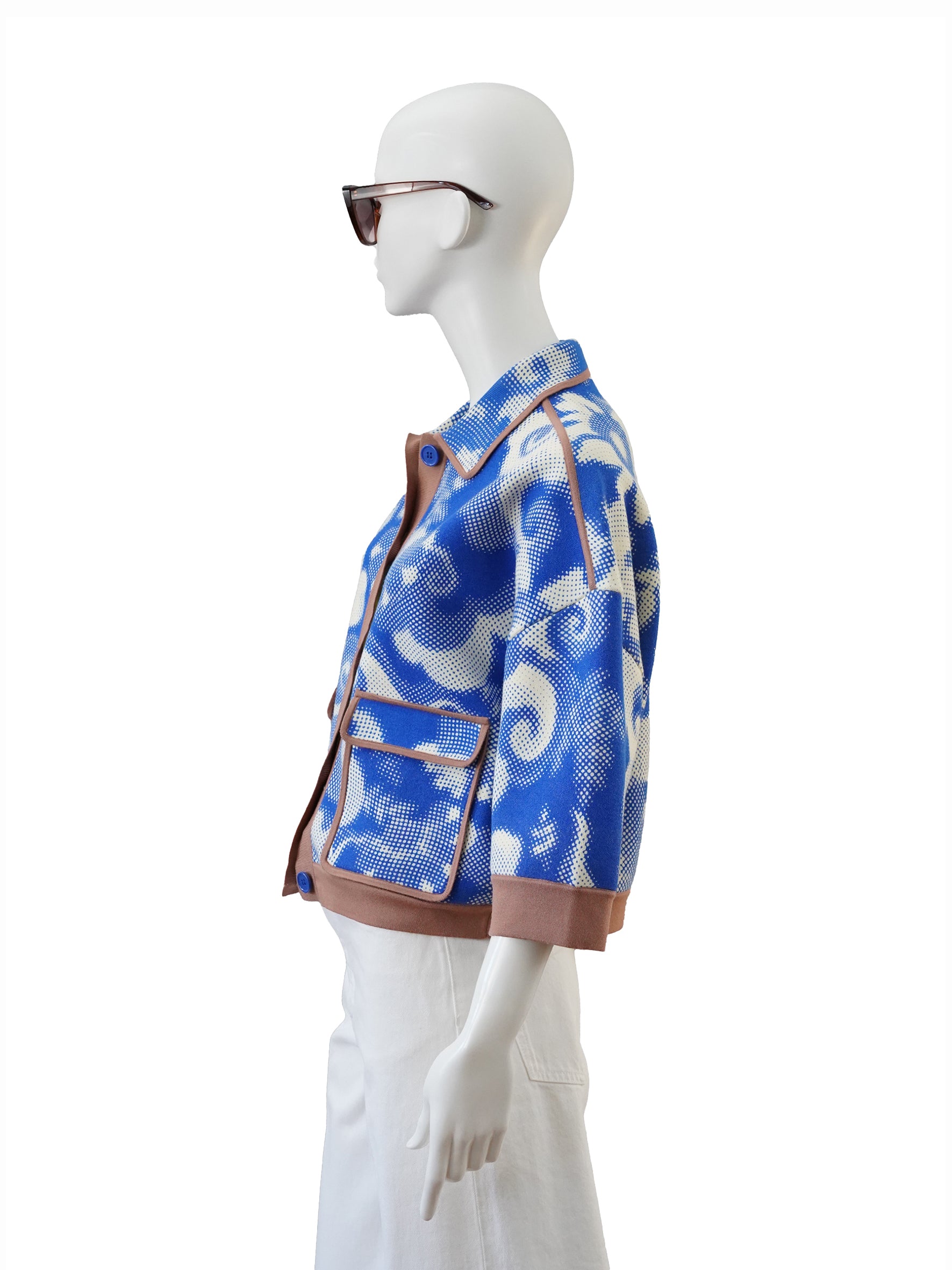 Blau/Cremefarbene, gemusterte Jacke mit braunen Details