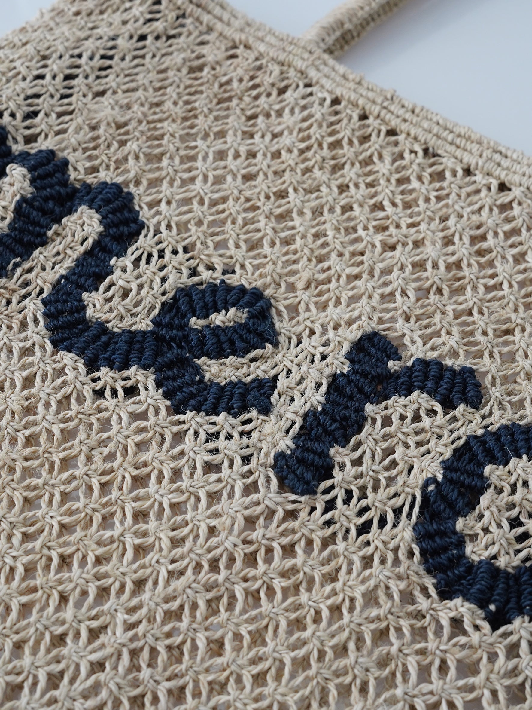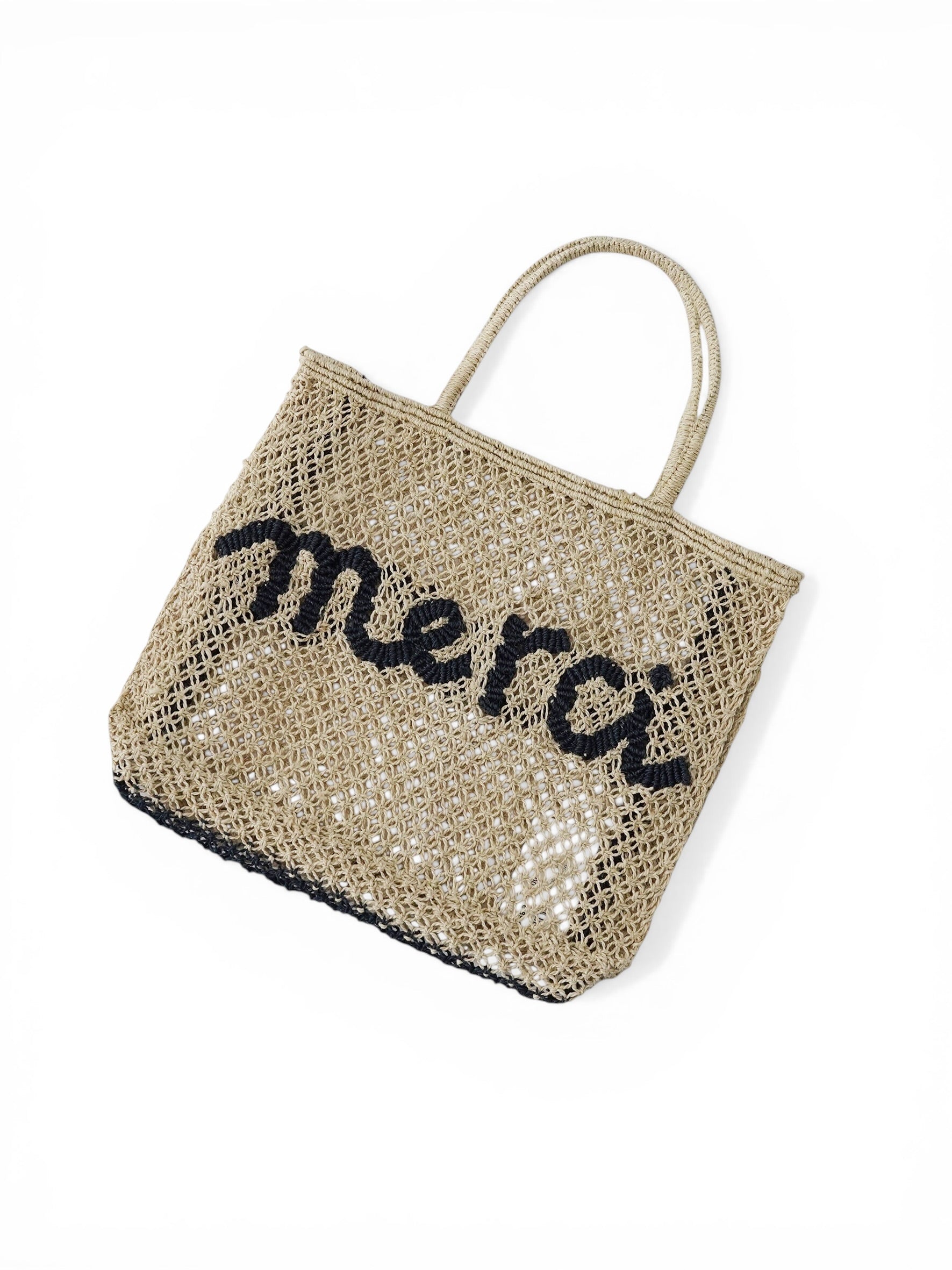 Sandfarbene Bast-Tasche mit dunkelblauem Schriftzug "merci"