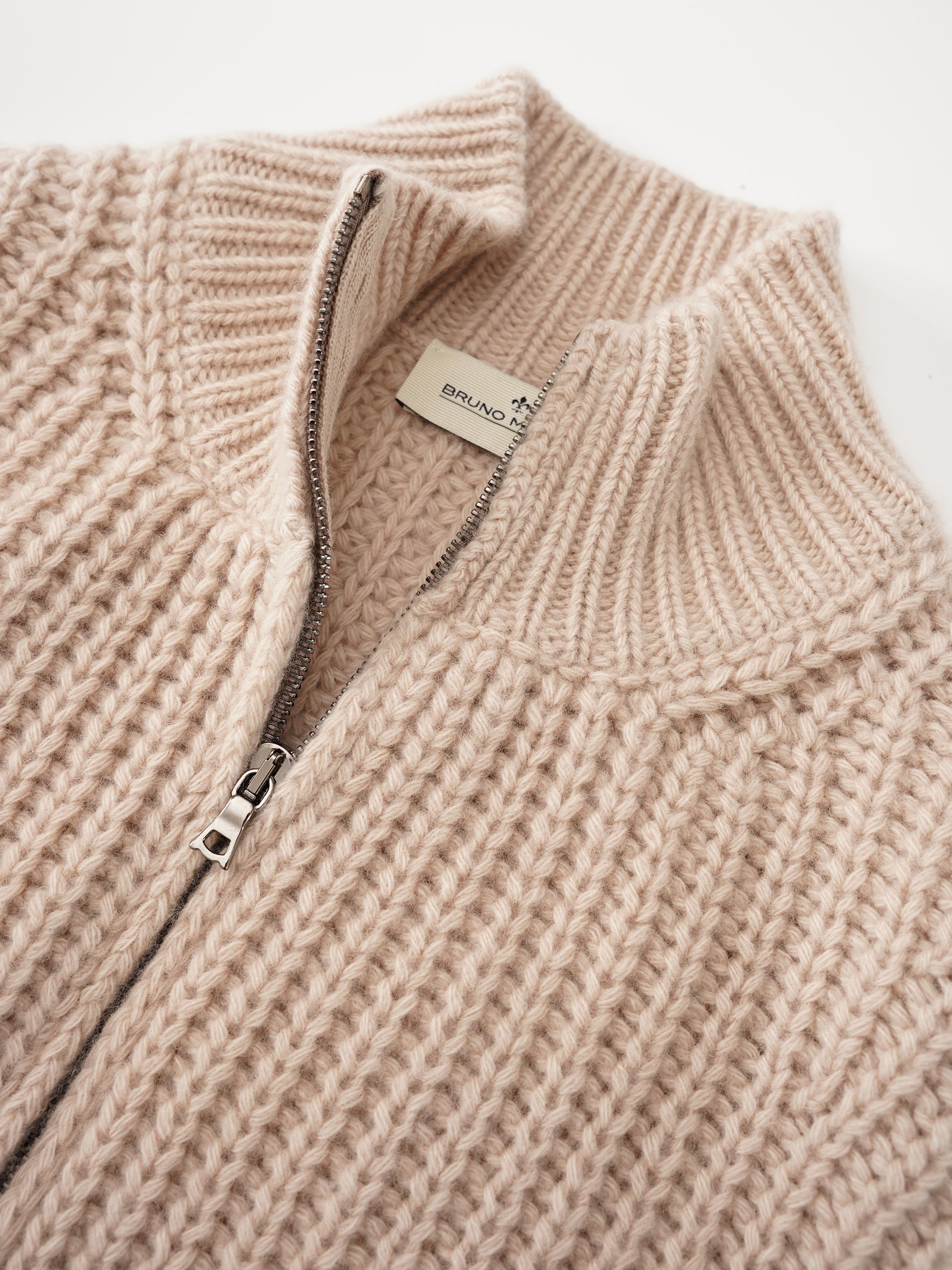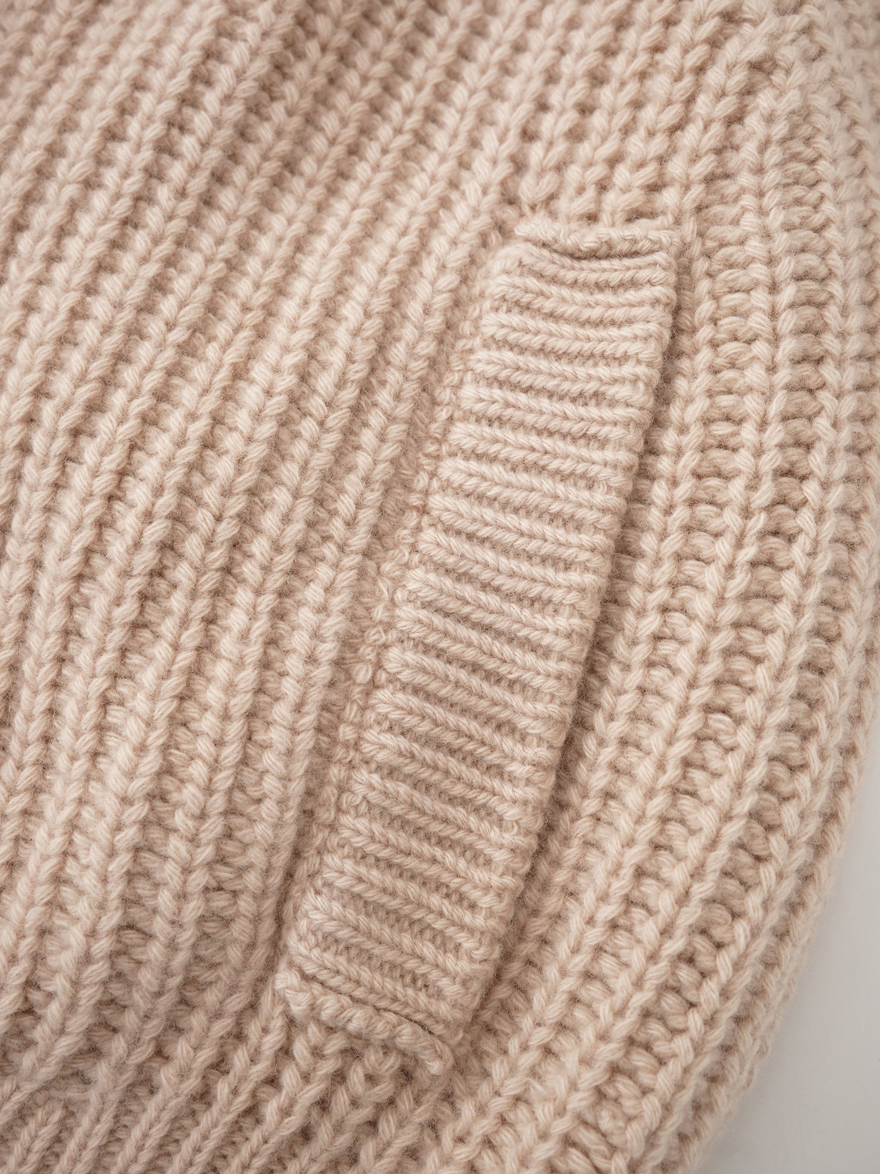 Sandfarbene, grob gestrickte Strickjacke aus Wolle und Cashmere