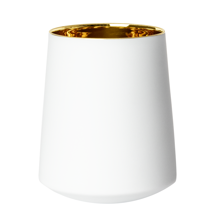 Das puristische Weiß der Wein- und Digestifbecher steht im eleganten Kontrast zu dem opulenten, warm leuchtenden 24-Karat-Gold im Inneren. Es unterstreicht die zarte Wertigkeit des Porzellans und hat einen zusätzlichen Effekt: Weiß- und Roséweine behalten ihre erfrischende Kühle, Rotweine lange ihre vorgegebene Trinktemperatur.