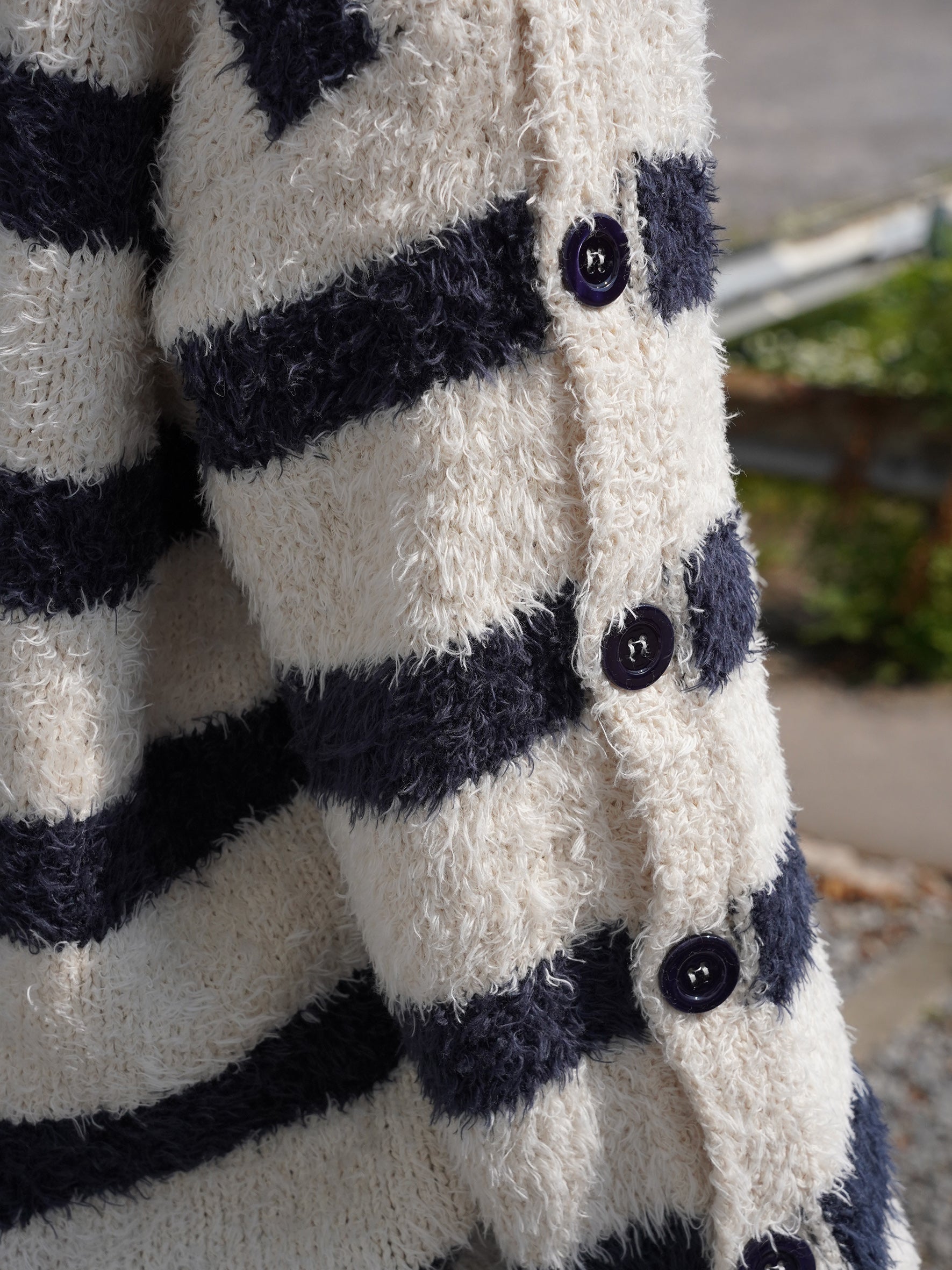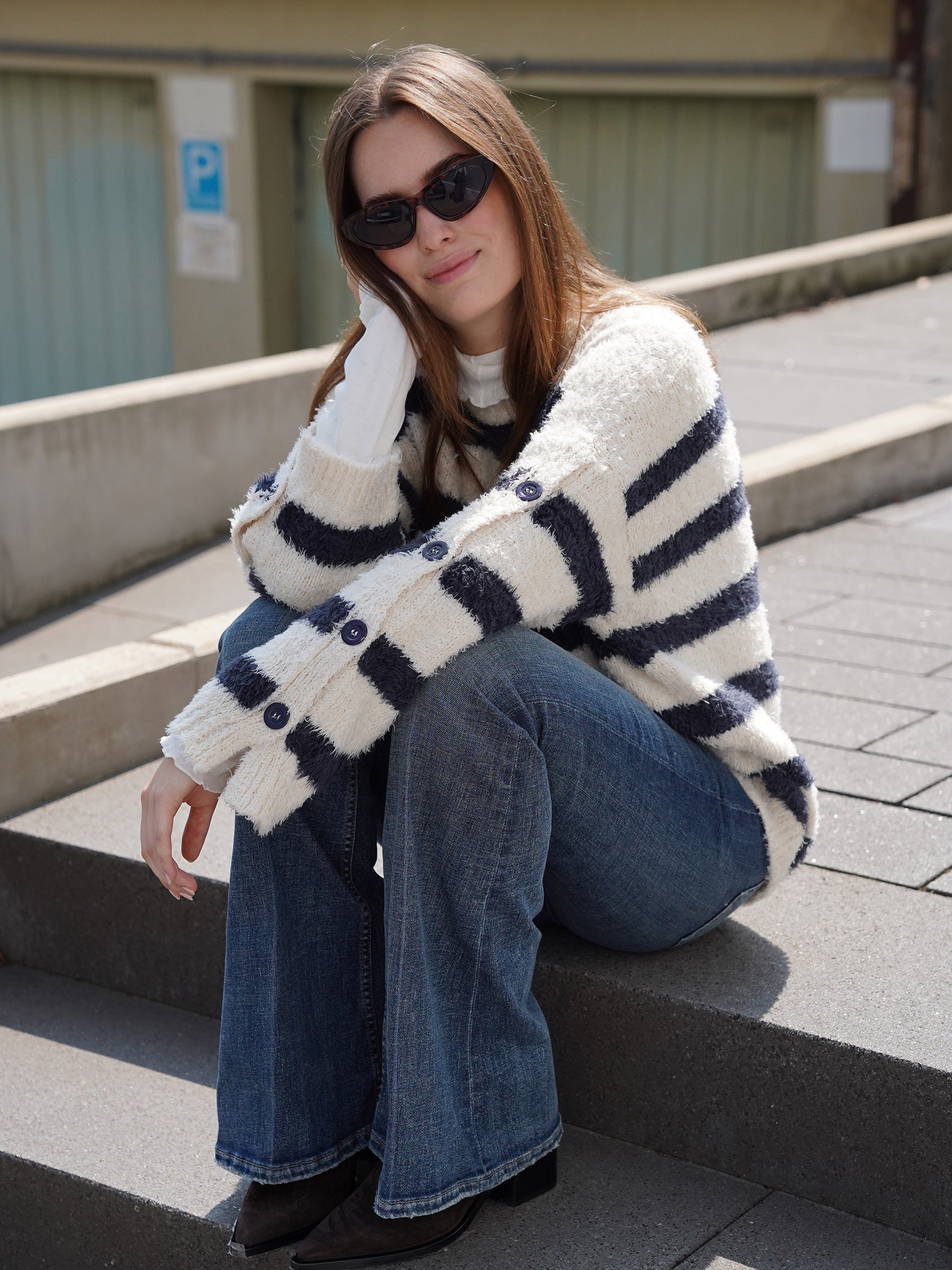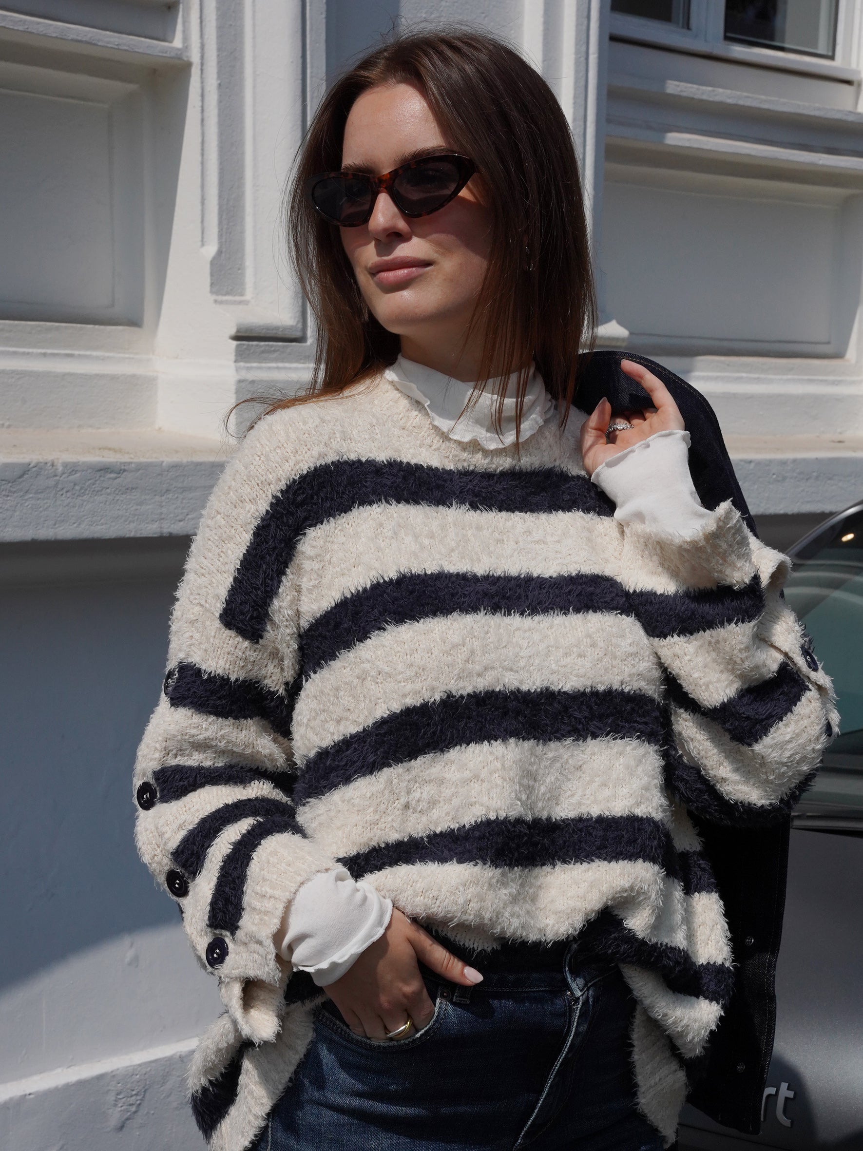 Creme/Dunkelblauer gestreifter Pullover mit Knopf-Details